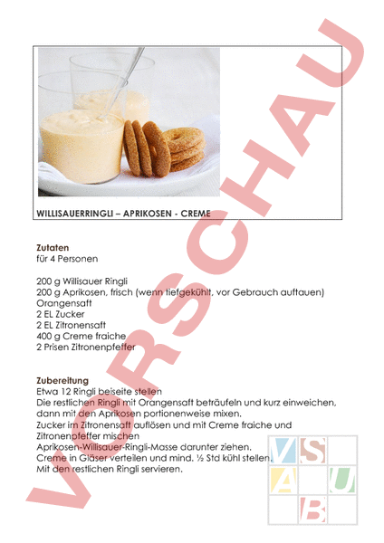 WILLISAUERRINGLI – APRIKOSEN CREME Zutaten für 4 Personen 200 Willisauer Ringli 200 Aprikosen, frisch (wenn tiefgekühlt, vor Gebrauch auftauen) Orangensaft 2 EL Zucker 2 EL Zitronensaft 400 Creme fraiche 2 Prisen Zitronenpfeffer Zubereitung Etwa 12 Ringli beiseite stellen Die restlichen Ringli mit Orangensaft beträufeln und kurz einweichen, dann mit den Aprikosen portionenweise mixen. Zucker im Zitronensaft auflösen und mit Creme fraiche und Zitronenpfeffer mischen Aprikosen-Willisauer-Ringli-Masse darunter ziehen. Creme in Gläser verteilen und mind. Std kühl stellen. Mit den restlichen Ringli servieren.