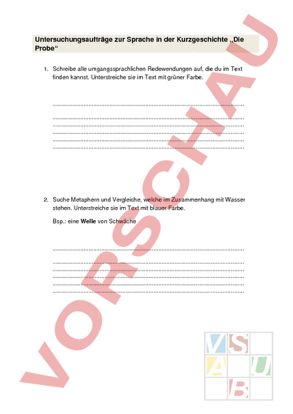 Untersuchungsaufträge zur Sprache in der Kurzgeschichte „Die Probe 1. Schreibe alle umgangssprachlichen Redewendungen auf, die du im Text finden kannst. Unterstreiche sie im Text mit grüner Farbe. . . . . . . 2. Suche Metaphern und Vergleiche, welche im Zusammenhang mit Wasser stehen. Unterstreiche sie im Text mit blauer Farbe. Bsp.: eine Welle von Schwäche . . . . . .