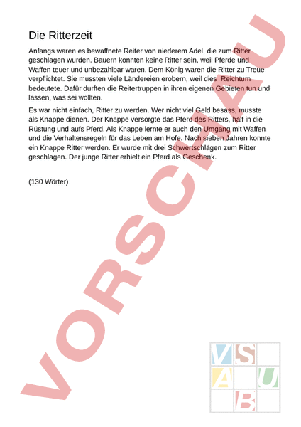 Die Ritterzeit Anfangs waren es bewaffnete Reiter von niederem Adel, die zum Ritter geschlagen wurden. Bauern konnten keine Ritter sein, weil Pferde und Waffen teuer und unbezahlbar waren. Dem König waren die Ritter zu Treue verpflichtet. Sie mussten viele Ländereien erobern, weil dies Reichtum bedeutete. Dafür durften die Reitertruppen in ihren eigenen Gebieten tun und lassen, was sei wollten. Es war nicht einfach, Ritter zu werden. Wer nicht viel Geld besass, musste als Knappe dienen. Der Knappe versorgte das Pferd des Ritters, half in die Rüstung und aufs Pferd. Als Knappe lernte er auch den Umgang mit Waffen und die Verhaltensregeln für das Leben am Hofe. Nach sieben Jahren konnte ein Knappe Ritter werden. Er wurde mit drei Schwertschlägen zum Ritter geschlagen. Der junge Ritter erhielt ein Pferd als Geschenk. (130 Wörter)