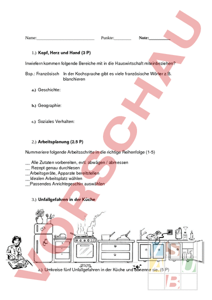 Name:_ Punkte: Note: 1.) Kopf, Herz und Hand (3 P) Inwiefern kommen folgende Bereiche mit in die Hauswirtschaft miteinbeziehen? Bsp.: Französisch In der Kochsprache gibt es viele französische Wörter z.B. blanchieren a.) Geschichte: b.) Geographie: c.) Soziales Verhalten: 2.) Arbeitsplanung (2.5 P) Nummeriere folgende Arbeitsschritte in die richtige Reihenfolge (15) Alle Zutaten vorbereiten, evtl. abwägen abmessen Rezept genau durchlesen Arbeitsgeräte, Apparate bereitstellen Idealen Arbeitsplatz wählen Passendes Anrichtegeschirr auswählen 3.) Unfallgefahren in der Küche a.) Umkreise fünf Unfallgefahren in der Küche und benenne sie. (5 P) Bsp.: Scherben auf dem Boden Schnittwunden 4.) Kräuter (3 P) Beschrifte die Kräuter mit der korrekten Bezeichnung. 5.) Sieden a.) Sieden heisst kochen im. (0.5 P) b.)Fülle die Lücken korrekt aus. (3 P) Arbeitsgeräte: Zubereitung: Flüssigkeit in Pfanne geben Pfanne Wasser zu_ auf Stufe aufkochen würzen (z. B. mit Bouillonpaste) oder EL Salz 6.) Abwaschen a.)Fülle die Lücken korrekt aus. (3.5 P) Vorarbeiten: • Wenn nötig, kurz unter Wasserstrahl abspülen (Saucenreste) und alles zusammenstellen (sortieren). • Tröge und Tropfbrett (Inhalt des Abflusssiebes in den Abfall geben). Abwaschen: • Beide Tröge zur Hälfte mit Wasser füllen. • In den Trog rechts einen „Strahl ins Wasser geben (so gibt es keinen Schaum, der beim Abwaschen stört). • • • Geschirrabwaschen (Reihenfolge!) Achtung: Geschirr hat auch Rückseiten! Im linken Trog in das gut heisse Spülwasser tauchen und auf diestellen. Das Geschirr gut b.) Ordner die Reihenfolge des Geschirrs beim Abwaschen in die richtige Reihenfolge: (2.5 P) 1 2 3 4 5