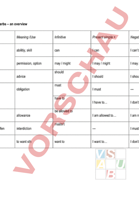 Modal verbs – an overview German Meaning /Use Infinitive Present simple Negative Past simple können abilitiy, skill can can can‘t could permission, option may might may might may might not --- should should not should must --- --- have to dont have to had to am allowed to am not allowed to was allowed to --- mustnt --- want to dont want to wanted to sollen advice Müssen obligation should must have to be allowed to Dürfen allowance mustn‘t nicht dürfen interdiction wollen to want sth want to Modal verbs – an overview German Meaning /Use Infinitive Present simple Negative Past simple können abilitiy, skill can can can‘t could permission, option may might may might may might not --- should should not should must --- --- have to dont have to had to am allowed to am not allowed to was allowed to --- mustnt --- want to dont want to wanted to sollen advice Müssen obligation should must have to be allowed to Dürfen allowance mustn‘t nicht dürfen interdiction wollen to want sth want to Modal verbs – an overview German können sollen müssen dürfen nicht dürfen wollen Meaning /Use Infinitive Present simple Negative Past simple abilitiy, skill can can can‘t could permission, option may might may might may might not --- advice should should should not should must --- --- have to dont have to had to must obligation have to allowance be allowed to am allowed to Im not allowed to was allowed to interdiction mustn‘t --- mustnt --- to want sth want to want to dont want to wanted to