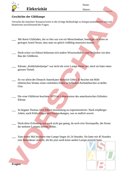 Name: Elektrizität Datum: Geschichte der Glühlampe Versuche die einzelnen Textausschnitte in die richtige Reihenfolge zu bringen (nummeriere sie) und beantworte anschliessend die Fragen. Mit ihrem Glühfaden, der so fein war wie ein Menschenhaar, benötigte sie einen so geringen Anteil Strom, dass man sie gleich vielfältig einsetzten konnte. Doch schon vor Edison befassten sich andere Wissenschaftler und Techniker mit dem Bau der Glühbirne. Edisons „Kohlefadenlampe war nicht die erste Lampe dieser Art, doch sie hatte einen grossen Vorteil. So vor allem der Deutsch-Amerikaner Heinrich Göbel. Er brachte mit Hilfe elektrischen Stroms einen verkohlten Faden in luftleeren Parfumflaschen zu heller Glut. Die erste Glühbirne leuchtete 1879 im Laboratorium des amerikanischen Erfinders Edison. So begann Thomas Alva Edison monatelang zu experimentieren. Nach einjähriger Arbeit, nach Fehlschlägen und Enttäuschungen, war es endlich soweit. Doch diese Erfindung war noch nicht gut genug, da noch eine Stromquelle, die Strom für mehrere Lampen lieferte, fehlte. Zum ersten Mal leuchtete eine Lampe länger als 24 Stunden. Sie hatte mit 45 Stunden eine Brenndauer erreicht, die bis jetzt noch keine andere Lampe erreicht hatte. Fragen: Name: Elektrizität Wann leuchtete die erste Glühbirne? Was war der Vorteil von Edisons Kohlenfadenlampe? Beschreibe die erste Lampe von Heinrich Göbel. Datum: