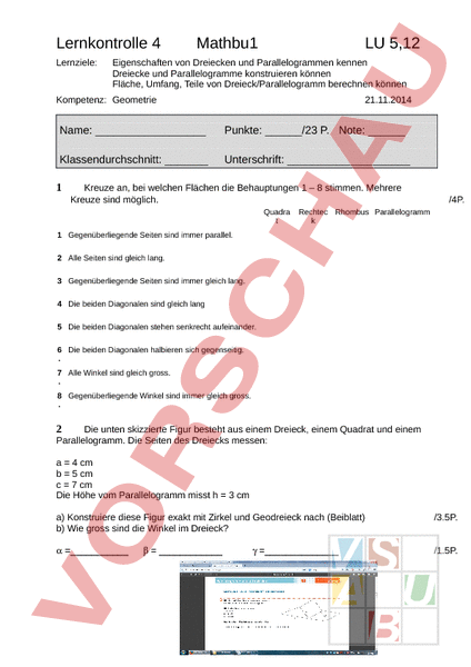 Lernkontrolle 4 Lernziele: Mathbu1 LU 5,12 Eigenschaften von Dreiecken und Parallelogrammen kennen Dreiecke und Parallelogramme konstruieren können Fläche, Umfang, Teile von Dreieck/Parallelogramm berechnen können Kompetenz: Geometrie 21.11.2014 Name: Punkte: /23 P. Note: Klassendurchschnitt: Unterschrift: 1 Kreuze an, bei welchen Flächen die Behauptungen 1 – 8 stimmen. Mehrere Kreuze sind möglich. Quadra /4P. Rechtec Rhombus Parallelogramm 1 Gegenüberliegende Seiten sind immer parallel. 2 Alle Seiten sind gleich lang. 3 Gegenüberliegende Seiten sind immer gleich lang. 4 Die beiden Diagonalen sind gleich lang 5 Die beiden Diagonalen stehen senkrecht aufeinander. 6 Die beiden Diagonalen halbieren sich gegenseitig. 7 Alle Winkel sind gleich gross. 8 Gegenüberliegende Winkel sind immer gleich gross. 2 Die unten skizzierte Figur besteht aus einem Dreieck, einem Quadrat und einem Parallelogramm. Die Seiten des Dreiecks messen: 4 cm 5 cm 7 cm Die Höhe vom Parallelogramm misst 3 cm a) Konstruiere diese Figur exakt mit Zirkel und Geodreieck nach (Beiblatt) b) Wie gross sind die Winkel im Dreieck? /3.5P. /1.5P. 3 Unten sind drei verschiedene Dreiecke und drei verschiedene Parallelogramme abgebildet. Bitte begründe die Aussagen unten. /2P. Aussage 1: Alle drei Dreiecke haben den gleichen Flächeninhalt. Stimmt, weil Stimmt nicht, weil Aussage 2: Alle drei Parallelogramme haben den gleichen Flächeninhalt. Stimmt, weil Stimmt nicht, weil 4 a) Berechne bei folgenden Figuren die fehlenden Angaben (inkl. Rechnungsweg!) /2.5P. b) Konstruiere den Rhombus mit Zirkel und Geodreieck (Beiblatt) Rechteck Rhombus Dreieck 46 cm 24 cm2 8 cm 6 cm ha 4 cm ha 18 cm2 /2P. Rechnungen: 5 Ein Dreieck hat eine Grundlinie 7,5 cm. Die dazugehörige Höhe c misst 4,2 cm. Dieses Dreieck hat die gleiche Fläche wie ein Rechteck mit der Breite 1,5 cm. Wie gross ist der Umfang des Rechtecks? Löse rein rechnerisch. /1.5P. 6 a) Zeichne auf dem Beiblatt ein Dreieck mit 4cm, 6 cm und 8 cm. /3P. b) Zeichne alle 3 Höhen ein. c) Wie gross ist die Fläche? Wende die Formel an und zeige den Rechnungsweg 7 /1P. Berechne die dunkle Fläche. /2P. Fläche:_ Rechnungen: Diese Prüfung war für mich einfach gerade richtig eher schwierig schwierig