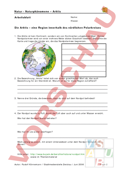 Natur Naturphänomene – Arktis Arbeitsblatt Name: Klasse: Die Arktis – eine Region innerhalb des nördlichen Polarkreises 1. Die Arktis ist kein Kontinent, sondern ein von Kontinenten umgebenes Meer. Dieses Nordpolarmeer wird von einer mehrere Meter dicken Eisschicht bedeckt. Betrachte die Karte und trage die Länder ein, die das Nordpolarmeer begrenzen. 2. Die Bezeichnung „Arktis leitet sich von einem griechischen Wort ab, das auch Bezeichnung für ein Sternbild ist. Warum ist sie für diese Region zutreffend? 3. Nenne drei Gründe, die beweisen, dass du dich auf dem Nordpol befindest! 4. Der Nordpol wurde zu Fuß, durch die Luft aber auch auf und unter Wasser erreicht. Wer hat den Nordpol zuerst betreten? Wer hat ihn als erster überflogen? Wem gelang es zuerst, mit einem Unterseeboot unter dem Nordpol hindurch zu fahren? Hilfe unter: sowie im Themenmaterial Autor: Rudolf Könnemann Stadtmedienstelle Zwickau Juni 2006 1 von 2 Natur Naturphänomene – Arktis 5. Eisbären sind die größten und stärksten Raubtiere der Arktis Im Winter kann es dort bis – 40C kalt werden. Warum erfrieren diese Tiere nicht? ist das Alfred –Wegener-Institut für Polar- und 6. Unter dem Logo Meeresforschung bekannt geworden. Warum erhielt das Institut diesen Namen? 7. Auf Spitzbergen wurde 1991 eine Polarforschungsstation mit dem Namen „Carl Koldewey eingerichtet. Nenne die wichtigsten Stationen im Leben dieses Forschers! Hilfe unter: 8. Die Polarstern ist das wichtigste Werkzeug der deutschen Polarforschung. Für welche wissenschaftlichen Aufgaben wurde sie konstruiert? Hilfe unter: 9. Arktis und Antarktis haben Gemeinsamkeiten aber auch viele Besonderheiten. Trage dafür Beispiele in die Tabelle ein! Arktis Antarktis Geologische Beschaffenheit Tierwelt Pflanzenwelt Temperatur Quellen: ; Autor: Rudolf Könnemann Stadtmedienstelle Zwickau Juni 2006 2 von 2 Natur Naturphänomene Arktis Lösungsblatt Die Arktis – eine Region innerhalb des nördlichen Polarkreises 1. Die Arktis ist kein Kontinent, sondern ein von Kontinenten umgebenes Meer. Dieses Nordpolarmeer wird von einer mehrere Meter dicken Eisschicht bedeckt. Betrachte die Karte und trage die Länder ein, die das Nordpolarmeer begrenzen. Teile von Teile von Teile von Grönland Teile von Teile von Teile von Russland USA (Alaska) Kanada Norwegen Schweden Finnland 2. Die Bezeichnung „Arktis leitet sich von einem griechischen Wort ab, das auch Bezeichnung für ein Sternbild ist. Warum ist sie für diese Region zutreffend? Die Bezeichnung Arktis leitet sich vom griechischen Wort arktos für Bär ab und bedeutet soviel wie Land unter dem (Sternbild des) Großen Bären. 3. Nenne drei Gründe, die beweisen, dass du dich auf dem Nordpol befindest! a. Nach erreichen des Nordpols stellt man fest, dass der Polartag sechs Monate und die Polarnacht auch sechs Monate dauert. b. Der Wind weht dort immer aus Richtung Süden und in Richtung Süden. Am Nordpol steht man auf einer Eisdecke über einem 4000m tiefen Meer. c. In der Arktis lebt der Eisbär. Den Pinguin findet man dagegen in der Antarktis. 4. Der Nordpol wurde zu Fuß, durch die Luft aber auch auf und unter Wasser erreicht. a. Wer hat den Nordpol zuerst betreten? Den geographischen Nordpol erreichte wahrscheinlich als erster Mensch der amerikanische Polarforscher Robert Edwin Peary im April 1909. b. Wer hat ihn als erster überflogen? Am 11.Mai 1926 überfolgen der Norweger Amundsen, der Amerikaner Ellsworth, und der Italiener Nobile mit dem Luftschiff Norge den Nordpol. c. Wem gelang es zuerst, mit einem Unterseeboot unter dem Nordpol hindurch zu fahren? Am 3. August 1958 erreichte das amerikanische Atom-U-Boot Nautilus unter dem arktischen Eisschild den Nordpol. Man stellte dort eine Wassertiefe von 4087 fest. Am 5. August 1958 wurde die erste Transpolardurchfahrt aus dem Pazifik in den Atlantik beendet. Hilfe unter: sowie im Themenmaterial Autor: Rudolf Könnemann Stadtmedienstelle Zwickau Juni 2006 1 von 2 Natur Naturphänomene Arktis 5. Eisbären sind die größten und stärksten Raubtiere der Arktis Im Winter kann es dort bis – 40C kalt werden. Warum erfrieren diese Tiere nicht? Das meist weiß gefärbte Fell der Eisbären besitzt keine Pigmente. So kann das Sonnenlicht ungehindert auf die schwarz gefärbte Haut durchdringen. Eine mehr als 10 cm dicke Fettschicht ergänzt die Anpassung an den polaren Lebensraum. Die Fußsohlen der Eisbären sind dicht behaart. Das dient dem Kälteschutz und verhindert ein Ausrutschen auf dem Eis. ist das Alfred –Wegener-Institut für Polar- und 6. Unter dem Logo Meeresforschung bekannt geworden. Warum erhielt das Institut diesen Namen? Alfred Wegener war einer der bedeutendsten deutschen Polarforscher. Sein Ruhm beruht vor allem auf der Theorie der Kontinentalverschiebung, die er mitbegründet und bekannt gemacht hat. Viermal begab sich Wegener auf eine Reise ins grönländische Inlandeis. Von seiner letzten Expedition 1930 kehrt er nicht zurück. 7. Auf Spitzbergen wurde 1991 eine Polarforschungsstation mit dem Namen „Carl Koldewey eingerichtet. Nenne wichtige Stationen im Leben dieses Forschers 1868 Leitung der ersten Nordpolarexpedition mit dem Schiff „Grönland. 1869/70 Zweite deutsche Nordpolarreise auf der „Germania. Ab 1871 Arbeit in der Deutschen Seewarte in Hamburg. 1875 Leitung der Abteilung „Nautische Instrumente. Maßgebliche Beteiligung an wissenschaftlichen Publikationen und Erzählungen. Hilfe unter: 8. Die Polarstern ist das wichtigste Werkzeug der deutschen Polarforschung. Für welche wissenschaftlichen Aufgaben wurde sie konstruiert? Das Schiff ist für biologische, geologische, geophysikalische, glaziologische, chemische und meteorologische Forschungsarbeiten ausgerüstet. Kühlräume und Aquarien erlauben den Transport von Proben und lebenden Meerestieren. Vermessungslote, die bis in 10.000 Tiefe reichen und bis zu 150 in den Boden eindringen können, werden mitgeführt. Hilfe unter: 9. Arktis und Antarktis haben Gemeinsamk