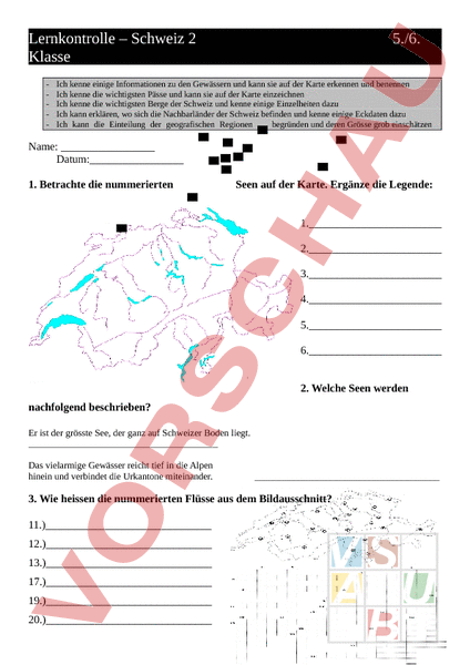 Lernkontrolle – Schweiz 2 Klasse 5./6. Ich kenne einige Informationen zu den Gewässern und kann sie auf der Karte erkennen und benennen Ich kenne die wichtigsten Pässe und kann sie auf der Karte einzeichnen Ich kenne die wichtigsten Berge der Schweiz und kenne einige Einzelheiten dazu Ich kann erklären, wo sich die Nachbarländer der Schweiz befinden und kenne einige Eckdaten dazu Ich kann die Einteilung der geografischen Regionen begründen und deren Grösse grob einschätzen Name: Datum:_ 1. Betrachte die nummerierten Seen auf der Karte. Ergänze die Legende: 1. 2. 3. 4. 5. 6. 2. Welche Seen werden nachfolgend beschrieben? Er ist der grösste See, der ganz auf Schweizer Boden liegt. Das vielarmige Gewässer reicht tief in die Alpen hinein und verbindet die Urkantone miteinander. 3. Wie heissen die nummerierten Flüsse aus dem Bildausschnitt? 11.) 12.) 13.) 17.) 19.) 20.) 4. Trage die Nummern der Pässe den korrekten Punkten auf der Karte zu: 1 Grimsel 2 Simplon 3 Brünig 4 Julier 5 Gr. St. Bernhard 6 Nufenen 5. Verbinde die Bilder mit den Beschreibungen der Berge und ergänze: 6. Unterteile die Schweiz in die drei geografischen Räume. Notiere die Namen der Regionen sowie die Grösse zur gesamten Schweiz in einer Prozentzahl. 7. Erkläre die Grafik in eigenen Worten in 3 Sätzen. 8. Vervollständige die Steckbriefe zu den Nachbarländern der Schweiz. Du darfst die Karte dazu benutzen. Die Anfangsbuchstaben der Länder sind angegeben: 9. Erstelle eine Skizze in der die Pässe in und aus dem Kt. Uri gekennzeichnet sind. Beschrifte in welche Kantone die Pässe führen. Du darfst die Karte benützen. Gesamtpunktzahl: /40 Note: Unterschrift Eltern: