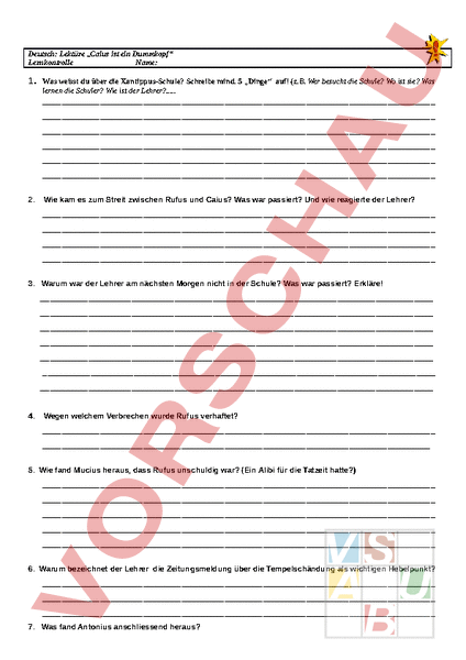 Deutsch: Lektüre „Caius ist ein Dummkopf Lernkontrolle Name: 1. Was weisst du über die Xantippus-Schule? Schreibe mind. 5 „Dinge auf! (z.B. Wer besucht die Schule? Wo ist sie? Was lernen die Schüler? Wie ist der Lehrer?. 2. Wie kam es zum Streit zwischen Rufus und Caius? Was war passiert? Und wie reagierte der Lehrer? 3. Warum war der Lehrer am nächsten Morgen nicht in der Schule? Was war passiert? Erkläre! 4. Wegen welchem Verbrechen wurde Rufus verhaftet? 5. Wie fand Mucius heraus, dass Rufus unschuldig war? (Ein Alibi für die Tatzeit hatte?) 6. Warum bezeichnet der Lehrer die Zeitungsmeldung über die Tempelschändung als wichtigen Hebelpunkt? 7. Was fand Antonius anschliessend heraus? 8 Wer ist Lukos? Welche Person steckt wirklich dahinter? Wie fanden es die Schüler heraus? (Denke auch an die Geheimbotschaft von Rufus!) 9. Wer hat Rufus in diese Schwierigkeiten gebracht? Und warum? Wie ist er vorgegangen? 10. Welche Aussagen sind richtig? Welche sind falsch? Kreuze an! richtig Aussagen 1. Der Lehrer lag gefesselt im Schrank 2. Claudia ist die Schwester von Mucius. 3. Das Geheimtreffen der Freunde ist ein Baumhaus. 4. Mucius entdeckte bei Lukos die Laterne von Rufus. 5. Scribonus war ein berühmter Schriftsachverständiger von Rom. 6. Die Zeitungsnachricht wurde vor der Tempelschändung geschrieben. 7. Lukos ist ein berühmter Gladiator von Rom. 8. Caius schrieb an den Tempel: „Caius ist ein Dummkopf. 9. Der Lehrer ist ein spanischer Gelehrter und gut in Germanistik. 10. Mucius ist ein Feigling. falsch 10. Korrigiere zwei falsche Aussage so, dass sie stimmt! Feedback: Punkte:/_ Note: Unterschrift: