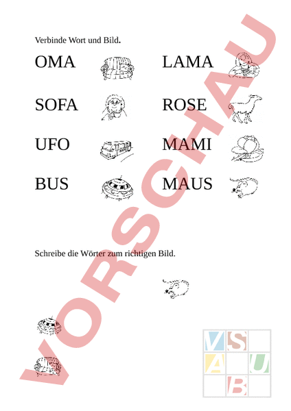 Verbinde Wort und Bild. OMA LAMA SOFA ROSE UFO MAMI BUS MAUS Schreibe die Wörter zum richtigen Bild.