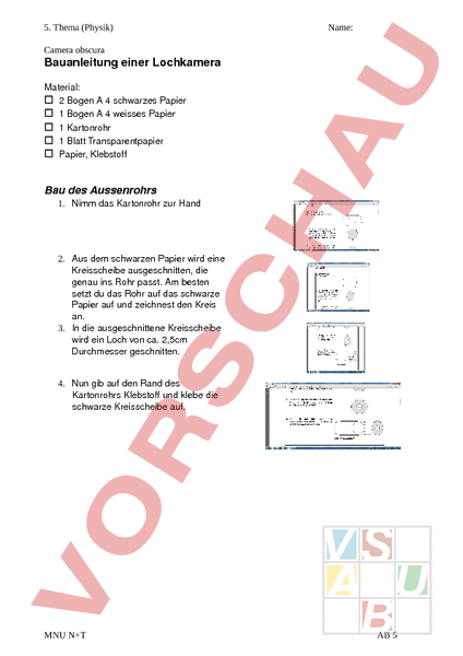 5. Thema (Physik) Name: Camera obscura Bauanleitung einer Lochkamera Material: 2 Bogen 4 schwarzes Papier 1 Bogen 4 weisses Papier 1 Kartonrohr 1 Blatt Transparentpapier Papier, Klebstoff Bau des Aussenrohrs 1. Nimm das Kartonrohr zur Hand 2. Aus dem schwarzen Papier wird eine Kreisscheibe ausgeschnitten, die genau ins Rohr passt. Am besten setzt du das Rohr auf das schwarze Papier auf und zeichnest den Kreis an. 3. In die ausgeschnittene Kreisscheibe wird ein Loch von ca. 2,5cm Durchmesser geschnitten. 4. Nun gib auf den Rand des Kartonrohrs Klebstoff und klebe die schwarze Kreisscheibe auf. MNU NT AB 5 Bau des Innenrohrs 5. Damit das Innenrohr mit dem Aussenrohr möglichst gut abschliesst, geht man wie folgt vor: Bestreiche den Kleberand des anderen schwarzen A4 Papiers für das Innenrohr mit Klebstoff, forme diesen A4 Bogen im Aussenrohr zu einem Zylinder und klebe diesen zusammen. Es ist darauf zu achten, dass das Innenrohr nicht mit dem Aussenrohr verklebt. 6. Stelle das Innenrohr, das du aus dem Aussenrohr herausziehen kannst, auf das Pergamentpapier. Zeichne nun wie rechts abgebildet Zacken ein (dunkelgrau). Nun sieht das Pergamentpapier aus wie eine Sonne. Schneide nun diese Form aus und bestreiche die Zacken mit Klebstoff. Klebe nun die Zacken ans Innenrohr, indem du sie nach oben biegst (siehe rechts). Stecke nun das Innenrohr mit dem festgemachten Pergamentpapier in das Aussenrohr. MNU NT AB 5 Bau des Blendenhalters und der Lochblenden 7. Schneide aus dem restlichen schwarzen Papier einen Halbkreis mit Ausschnitt für das Loch aus und bestreiche nur den Rand mit Klebstoff. Befestige diesen als Blendenhalter vor der Kreisscheibe. 8. Schneide aus dem restlichen schwarzen Papier zwei Blenden aus (siehe rechts) und stich mit einer Nadel (oder Nagel, Ahle) jeweils ein Loch mit ca. 1mm bzw. 4mm Durchmesser hinein. Stecke nun jeweils eine Blende in den Blendenhalter. Schaue nun in die Kamera und wechsle jeweils die Blenden. Was erkennst du? Bearbeite dazu das nächste Arbeitsblatt. MNU NT AB 5 Camera obscura Arbeitsblatt zur Lochkamera 1. Baue die Lochkamera gemäss Anleitung. 2. Zünde eine Kerze an und schaue durch die Kamera auf die Flamme. Was stellst du auf dem Pergamentpapier fest? Fasse in eigenen Worten. 3. Wie ändert sich das Abbild der Kerzenflamme auf dem Pergamentpapier, wenn du eine Lochblende mit einem grösseren Loch nimmst? 4. Variiere Distanz und Winkel zur Kerze. Was stellst du fest? Verschiebe auch das Innenrohr. 5. Zeichne in der folgenden Skizze deine Erkenntnisse ein. MNU NT AB 5 6. Was könnte man tun, damit das Bild scharf wird? MNU NT AB 5 LÖSUNG 2. Zünde eine Kerze an und schaue durch die Kamera auf die Flamme. Was stellst du auf dem Pergamentpapier fest? Fasse in eigenen Worten. Die Kerze wird punktsymmetrisch auf das Pergamentpapier abgebildet. Das Bild steht auf dem Kopf. 3. Wie ändert sich das Abbild der Kerzenflamme auf dem Pergamentpapier, wenn du eine Lochblende mit einem grösseren Loch nimmst? Das Bild wird heller aber weniger deutlich (scharf). 4. Variiere Distanz und Winkel zur Kerze. Was stellst du fest? Verschiebe auch das Innenrohr. Individuell 5. Zeichne in der folgenden Skizze deine Erkenntnisse ein. 6. Was könnte man tun, damit das Bild scharf wird? Man könnte eine Sammellinse einbauen, die das Licht optimal auf das Pergamentpapier projiziert. Somit hätten wir einen vereinfachten Photoapparat. Unser Auge funktioniert genau gleich. MNU NT AB 5