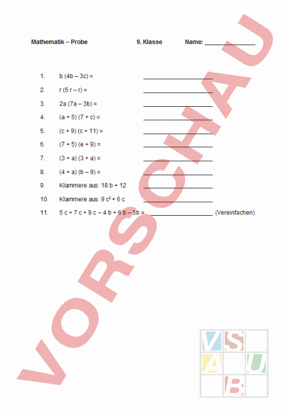 Mathematik – Probe 9. Klasse Name: 1. (4b – 3c) 2. (5 – r) 3. 2a (7a – 3b) 4. (a 5) (7 c) 5. (c 9) (c 11) 6. (7 5) (e 9) 7. (3 a) (3 a) 8. (4 a) (b – 9) 9. Klammere aus: 18 12 10. Klammere aus: 9 c2 6 11. 5 7 9 – 4 6 – 5b (Vereinfachen)