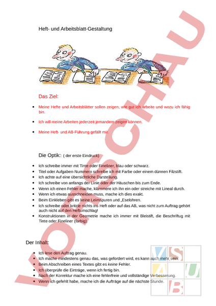 Heft- und Arbeitsblatt-Gestaltung Das Ziel: • Meine Hefte und Arbeitsblätter sollen zeigen, wie gut ich arbeite und wozu ich fähig bin. • Ich will meine Arbeiten jederzeit jemandem zeigen können. • Meine Heft- und AB-Führung gefällt mir. Die Optik:: der erste Eindruck) • • • • • • • • • Ich schreibe immer mit Tinte oder Fineliner, blau oder schwarz. Titel oder Aufgaben-Nummern schreibe ich mit Farbe oder einem dünnen Filzstift. Ich achte auf eine übersichtliche Darstellung. Ich schreibe von anfangs der Linie oder der Häuschen bis zum Ende. Wenn ich einen Fehler mache, klammere ich ihn ein oder streiche mit Lineal durch. Wenn ich etwas ausschneiden muss, mache ich dies exakt. Beim Einkleben gibt es keine Leimspuren und „Eselohren. Ich schreibe oder kritzle nichts ins Heft oder auf das AB, was nicht zum Auftrag gehört auch nicht auf den Heftumschlag! Konstruktionen in der Geometrie mache ich immer mit Bleistift, die Beschriftug mit Tinte oder Fineliner (farbig). Der Inhalt: • • • • • • Ich lese den Auftrag genau. Ich mache mindestens genau das, was gefordert wird, es kann auch mehr sein. Beim Abschreiben eines Textes gibt es keine Fehler. Ich überprüfe die Einträge, wenn ich fertig bin. Nach der Korrektur mache ich eine fehlerfreie und vollständige Verbesserung. Wenn ich gefehlt habe, mache ich die Aufträge auf die nächste Stunde.