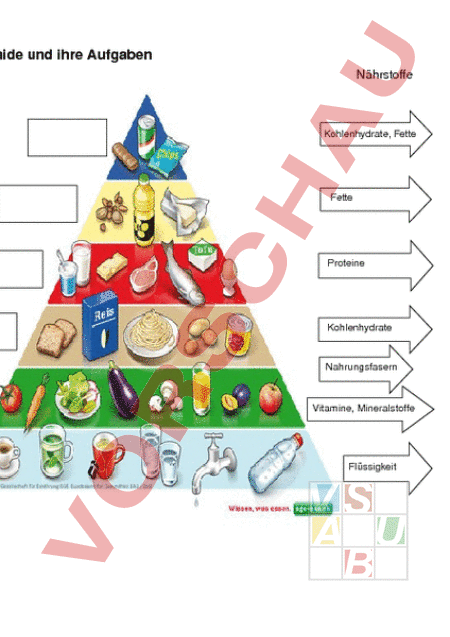 Die Pyramide und ihre Aufgaben Nährstoffe Kohlenhydrate, Fette Fette Aufgaben im Körper Schnelle Energielieferanten Hochkonzentrierte Energie/ fettlösliche Vitamine Proteine Baustoffe unseres Körpers Kohlenhydrate Energielieferanten Nahrungsfasern Für eine gute Verdauung Vitamine, Mineralstoffe Lebenswichtige Funktionen in den Zellen Flüssigkeit Lösungs,Transportmittel für Nährstoffe Wärmeregulator