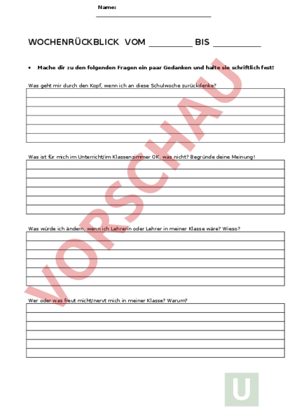 Name: WOCHENRÜCKBLICK VOM BIS Mache dir zu den folgenden Fragen ein paar Gedanken und halte sie schriftlich fest! Was geht mir durch den Kopf, wenn ich an diese Schulwoche zurückdenke? Was ist für mich im Unterricht/im Klassenzimmer OK, was nicht? Begründe deine Meinung! Was würde ich ändern, wenn ich Lehrerin oder Lehrer in meiner Klasse wäre? Wieso? Wer oder was freut micht/nervt mich in meiner Klasse? Warum?