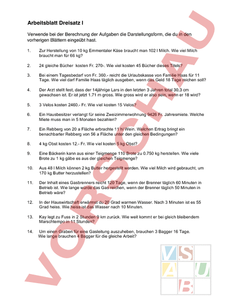 Arbeitsblatt Dreisatz Verwende bei der Berechnung der Aufgaben die Darstellungsform, die du in den vorherigen Blättern eingeübt hast. 1. Zur Herstellung von 10 kg Emmentaler Käse braucht man 102 Milch. Wie viel Milch braucht man für 66 kg? 2. 24 gleiche Bücher kosten Fr. 270-. Wie viel kosten 45 Bücher dieses Titels? 3. Bei einem Tagesbedarf von Fr. 360.- reicht die Urlaubskasse von Familie Haas für 11 Tage. Wie viel darf Familie Haas täglich ausgeben, wenn das Geld 18 Tage reichen soll? 4. Der Arzt stellt fest, dass der 14jährige Lars in den letzten 3 Jahren total 30,3 cm gewachsen ist. Er ist jetzt 1.71 gross. Wie gross wird er also sein, wenn er 18 wird? 5. 3 Velos kosten 2460.- Fr. Wie viel kosten 15 Velos? 6. Ein Hausbesitzer verlangt für seine Zweizimmerwohnung 9426 Fr. Jahresmiete. Welche Miete muss man in 5 Monaten bezahlen? 7. Ein Rebberg von 20 Fläche erbrachte 11 hl Wein. Welchen Ertrag bringt ein benachbarter Rebberg von 56 Fläche unter den gleichen Bedingungen? 8. 4 kg Obst kosten 12.- Fr. Wie viel kosten 5 kg Obst? 9. Eine Bäckerin kann aus einer Teigmenge 110 Brote zu 0.750 kg herstellen. Wie viele Brote zu 1 kg gäbe es aus der gleichen Teigmenge? 10. Aus 48 Milch können 2 kg Butter hergestellt werden. Wie viel Milch wird gebraucht, um 170 kg Butter herzustellen? 11. Der Inhalt eines Gasbrenners reicht 120 Tage, wenn der Brenner täglich 60 Minuten in Betrieb ist. Wie lange würde das Gas reichen, wenn der Brenner täglich 50 Minuten in Betrieb wäre? 12. In der Hauswirtschaft erwärmst du 20 Grad warmen Wasser. Nach 3 Minuten ist es 55 Grad heiss. Wie heiss ist das Wasser nach 10 Minuten. 13. Kay legt zu Fuss in 2 Stunden 9 km zurück. Wie weit kommt er bei gleich bleibendem Marschtempo in 11 Stunden? 14. Um einen Graben für eine Gasleitung auszuheben, brauchen 3 Bagger 16 Tage. Wie lange brauchen 4 Bagger für die gleiche Arbeit?