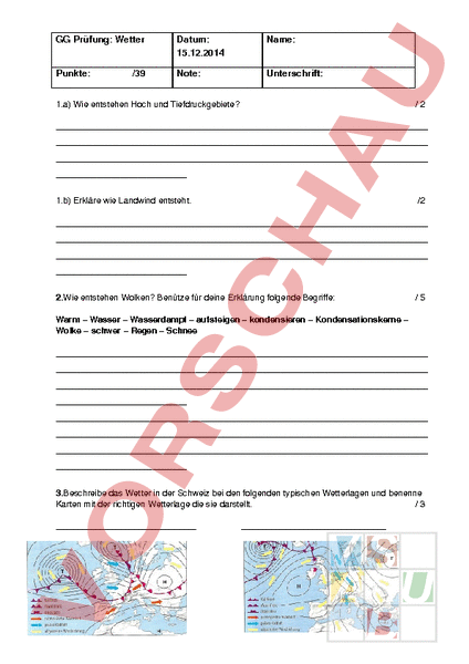 GG Prüfung: Wetter Datum: 15.12.2014 Name: Punkte: Note: Unterschrift: /39 1.a) Wie entstehen Hoch und Tiefdruckgebiete? /2 1.b) Erkläre wie Landwind entsteht. /2 2.Wie entstehen Wolken? Benütze für deine Erklärung folgende Begriffe: /5 Warm – Wasser – Wasserdampf – aufsteigen – kondensieren – Kondensationskerne – Wolke – schwer – Regen – Schnee 3.Beschreibe das Wetter in der Schweiz bei den folgenden typischen Wetterlagen und benenne Karten mit der richtigen Wetterlage die sie darstellt. /3 a.Staulage (Nordföhn) Benütze folgende Begriffe: Alpen – feucht – nördlich – steigen – Wolken – ausregen – sinkt – trocken – Sonne – regnet /5 b.Bisenlage /5 Benütze folgende Begriffe: Hochdruckgebiet – Mittelmeer – Ost – bis Nordostströmung – Kaltluft – 70km/h – Nebeldecke – Mittelland – Alpen –Jurakette kanalisiert c.Westwindlage /4 Nutze die folgende Wetterkarte und beschreibe das Wetter der angegebenen Orte. Beziehe dich dabei auf die Bewölkung, die Windstärke und –richtung und die Temperatur. a) Krakau b) Nizza 4.Bestimme ob folgende Aussagen richtig oder falsch sind? Aussagen zum Wetter 1. Wenn Wasserdampf kondensiert, entstehen feine Wassertröpfchen. 2. Gewitterwolken erkennt man gut an ihrer Schleierform. 3. Warme Luft zieht sich zusammen. 4. Bei Bisenlage (in der Schweiz) kommt der Wind aus Westen. 5. Bei einer Zyklone handelt es sich um ein Tiefdruckgebiet. 6. Bei Südföhn scheint bei uns meist die Sonne. 7. Aus einer Wetterkarte kann ich die Bewölkung herauslesen. 8. Auf dem Mythen ist der Luftdruck tiefer als in Einsiedeln /8 richtig falsch 5. Definiere folgende Begriffe: /5 Wetter: Klima: Aggregatzustände: Luftdruck: Verdunstung: