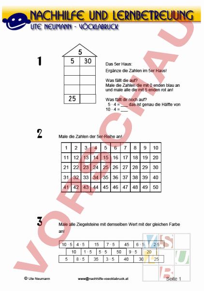 5 1 30 5 Das 5er Haus: Ergänze die Zahlen im 5er Haus! Was fällt die auf? Male die Zahlen die mit 0 enden blau an und male alle die mit 5 enden rot an! 25 2 Male die Zahlen der 5er-Reihe an! 1 3 Was fällt dir noch auf? 5 · 4 das ist genau die Hälfte von 10 · 4 2 3 4 5 6 7 8 9 10 11 12 13 14 15 16 17 18 19 20 21 22 23 24 25 26 27 28 29 30 31 32 33 34 35 36 37 38 39 40 41 42 43 44 45 46 47 48 49 50 Male alle Ziegelsteine mit demselben Wert mit der gleichen Farbe an! 10 · 5 10 5 Ute Neumann 4·5 15 1·5 8·5 5·5 35 45 7·5 3·5 6·5 9·5 50 40 2·5 20 30 25 Seite 1 4 Der 5er-Wurm kriecht vorwärts 5 5 6 10·5_ ·5 50:5_ Ute Neumann 35:5_ 40:5_ 30:5_ 10:5_ 25:5_ 45:5_ 5:5_ 20:5_ Seite 2 7 Verbinde die Zahlen der 5er-Reihe miteinander! 8 Male die Kästchen mit den Zahlen der 5er-Reihe an! Ute Neumann Seite 3