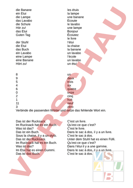 die Banane ein Etui die Lampe das Lavabo die Schule Hör zu! das Etui Guten Tag der Stuhl die Etui das Buch ein Lavabo eine Lampe eine Banane Hört zu! les étuis la lampe une banane Ecoute le lavabo une lampe Bonjour Écoutez le livre létui la chaise la banane un lavabo lécole un lavabo un étui 8 un 9 deux 5 trois 4 six 6 quatre 0 onze 2 cinq 1 huit 11 neuf 3 zéro Verbinde die passenden Wörter und setze das fehlende Wort ein. Das ist der Rucksack. Im Rucksack hat es ein Buch. Was ist das? Das ist ein Buch. Sous la chaise, il a un stylo. Das ist der Rucksack. Im Rucksack hat es ein Buch. Was ist das? Im Etui hat es einen Gummi. Das ist das Buch. Cest un livre. Quest-ce que cest? Cest le livre. Dans le sac à dos, il a un livre. Cest le sac à dos. Unter dem Stuhl hat es einen Fülli. Quest-ce que cest? Dans létui il a une gomme. Dans le sac à dos, il a un livre. Cest le sac à dos.