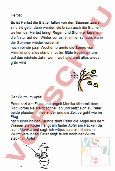 Herbst Es ist Herbst die Blätter fallen von den Bäumen zuerst sind sie gelb, dann werden sie braun auch die Blumen welken der Herbst bringt Regen und Sturm er bereitet die Natur auf den Winter vor es ist immer schade, wenn der Sommer wieder vorbei ist noch vor ein paar Wochen brannte die Sonne vom Himmel und alles stand in voller Blüte freuen wir uns auf das nächste Jahr, wenn weit und breit alles wieder grün wird Der Wurm im Apfel Peter sitzt am Fluss und angelt Monika fährt mit dem Rad vorbei sie steigt schnell ab und setzt sich zu Peter beide plaudern miteinander und die Zeit vergeht wie im Flug nach einer halben Stunde zieht Peter die Angel aus dem Wasser als Köder hängt ein fauler Apfel am Hacken da lacht Monika und sagt: ich würde es mal mit einem Wurm versuchen Peter sagt: tu ich doch der Wurm steckt im Apfel Der Rabe und der Fuchs Ein Rabe hat ein Stück Käse gefunden nun sitzt er zufrieden auf einem Baum und hält den Käse im Schnabel das riecht ein Fuchs er schleicht herbei und sieht hungrig hinauf wie gerne hätte er den Käse er grüsst den Raben: guten Morgen, lieber Freund wie schön dich hier zu sehen du siehst so vornehm aus wie prächtig dein Gefieder in der Sonne glänzt wenn du auch noch eine schöne Stimme hättest, wärst du der schönste Vogel im Wald diese Schmeichelei hört der Rabe gern voll Stolz bläst er sich auf er öffnet den Schnabel und krächzt da fällt der Käse herunter ins Gras der Fuchs packt die Beute und frisst sie auf Herbst Es ist Herbst. Die Blätter fallen von den Bäumen. Zuerst sind sie gelb, dann werden sie braun. Auch die Blumen welken. Der Herbst bringt Regen und Sturm. Er bereitet die Natur auf den Winter vor. Es ist immer schade, wenn der Sommer wieder vorbei ist. Noch vor ein paar Wochen brannte die Sonne vom Himmel und alles stand in voller Blüte. Freuen wir uns auf das nächste Jahr, wenn weit und breit alles wieder grün wird. Der Wurm im Apfel Peter sitzt am Fluss und angelt. Monika fährt mit dem Rad vorbei. Sie steigt schnell ab und setzt sich zu Peter. Beide plaudern miteinander und die Zeit vergeht wie im Flug. Nach einer halben Stunde zieht Peter die Angel aus dem Wasser. Als Köder hängt ein fauler Apfel am Hacken. Da lacht Monika und sagt: Ich würde es mal mit einem Wurm versuchen. Peter sagt: Tu ich doch. Der Wurm steckt im Apfel. Der Rabe und der Fuchs Ein Rabe hat ein Stück Käse gefunden. Nun sitzt er zufrieden auf einem Baum und hält den Käse im Schnabel. Das riecht ein Fuchs. Er schleicht herbei und sieht hungrig hinauf. Wie gerne hätte er den Käse. Er grüsst den Raben: Guten Morgen, lieber Freund! Wie schön dich hier zu sehen. Du siehst so vornehm aus. Wie prächtig dein Gefieder in der Sonne glänzt. Wenn du auch noch eine schöne Stimme hättest, wärst du der schönste Vogel im Wald. Diese Schmeichelei hört der Rabe gern. Voll Stolz bläst er sich auf. Er öffnet den Schnabel und krächzt. Da fällt der Käse herunter ins Gras. Der Fuchs packt die Beute und frisst sie auf.