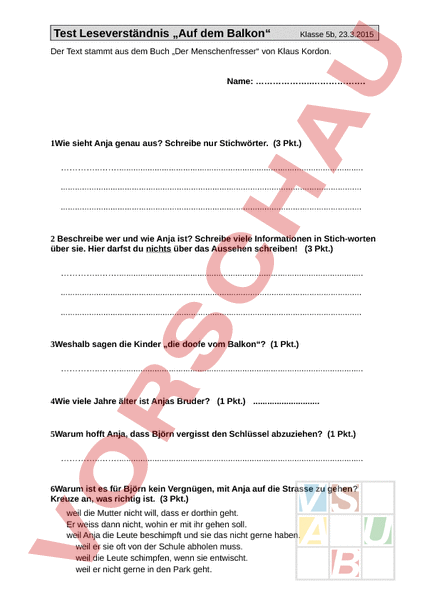 Test Leseverständnis „Auf dem Balkon Klasse 5b, 23.3.2015 Der Text stammt aus dem Buch „Der Menschenfresser von Klaus Kordon. Name: . 1Wie sieht Anja genau aus? Schreibe nur Stichwörter. (3 Pkt.) . . 2 Beschreibe wer und wie Anja ist? Schreibe viele Informationen in Stich-worten über sie. Hier darfst du nichts über das Aussehen schreiben! (3 Pkt.) . . 3Weshalb sagen die Kinder „die doofe vom Balkon? (1 Pkt.) 4Wie viele Jahre älter ist Anjas Bruder? (1 Pkt.) 5Warum hofft Anja, dass Björn vergisst den Schlüssel abzuziehen? (1 Pkt.) 6Warum ist es für Björn kein Vergnügen, mit Anja auf die Strasse zu gehen? Kreuze an, was richtig ist. (3 Pkt.) weil die Mutter nicht will, dass er dorthin geht. Er weiss dann nicht, wohin er mit ihr gehen soll. weil Anja die Leute beschimpft und sie das nicht gerne haben. weil er sie oft von der Schule abholen muss. weil die Leute schimpfen, wenn sie entwischt. weil er nicht gerne in den Park geht. 7Was macht Björn genau, nachdem er Anjas Haare getrocknet hat, bis er merkt, dass es seltsam still ist? (2 Pkt.) 8Wo findet Björn seine Schwester, nachdem sie abgehauen ist? (1 Pkt.) 9Was spielen Elke und Anja alles zusammen? (2 Pkt.) 10Warum muss Elke plötzlich gehen? (2 Pkt.) . . 11Wer war in dieser Geschichte mutig und warum? (2 Pkt.) . . Max. Punkte: . 21 Klasse: erreichte Punkte: Note: . Unterschrift der Eltern: .