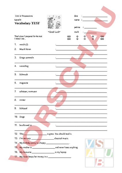 Unit 1/ Possessions date Level name Vocabulary TEST *Good Luck* Thats how prepared for the test: think did. points mark 1. watch (2) :_ 2. Musik hören :_ 3. Dinge sammeln :_ 4. vorsichtig :_ 5. Schmuck :_ 6. magazine :_ 7. schätzen, vermuten :_ 8. immer :_ 9. Schüssel :_ 10. Ziege :_ 11. be allowed to :_ 12. This is great. You should read it. 13. Im not very classical music. 14. My birthday party is happy 15. My mother is and never loses anything. 16. My favourite is my laptop. 17. My sister keeps her money in . 18. monk is wear orange robes. 19. nie, niemals :_ 20. Sport treiben :_ 21. häufig :_ 22. sometimes :_ 23. modisch :_ 24. normalerweise :_ 25. (etw.) wichtig finden :_ 26. dürfen :_ 27. keep :_ 28. adjective starting with an s. :_ 29. adjective starting with an s. :_ 30. adjective starting with an s. :