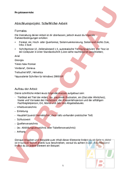 Projektunterricht Abschlussprojekt: Schriftliche Arbeit Formales Die Gestaltung deiner Arbeit ist dir überlassen; jedoch musst du folgende Rahmenbedingungen erfüllen: • Format: A4, Hoch- oder Querformat, Seitennummerierung, Seitenrand rechts 2cm, links 2.5cm • Schriftgrösse 12, Zeilenabstand 1.5, automatische Trennung aktiviert. Der Text ist mit Computer in einer Standardschrift (Liste siehe nachfolgend) geschrieben; Arial Georgia Times New Roman Verdana*, Geneva Trebuchet MS*, Helvetica *äquivalente Schriften für Windows 2000/XP Aufbau der Arbeit Deine schriftliche Arbeit muss folgendermassen aufgebaut sein: Titelblatt mit Titel der Arbeit, (ev. passende Illustration, ein Zitat oder Ähnliches); Name und Vorname des Verfassers, der Klassenlehrperson und der allfälligen Fachbegleitperson; Ort, Monat und Jahr des Abgabedatums. Inhaltsverzeichnis Einleitung Hauptteil (zuerst theoretischer, dann falls vorhanden praktischer Teil) Schlusswort Quellenverzeichnis (ev. Abbildungsverzeichnis oder Tabellenverzeichnis) Anhang Genaue Angaben und Beispiele zum Inhalt dieser Elemente findest du ab Seite 4; dabei ist in kursiver Schrift jeweils kurz beschrieben, worauf du achten musst. Anschliessend findest du zu jedem Element ein Beispiel. 1 Projektunterricht Zitierregeln In einer Präsentation, einer Facharbeit oder einem ähnlichen Werk benutzt man Informationen, die andere Leute erarbeitet und aufgeschrieben haben, um ein bestimmtes Thema darzustellen. Jedes Buch, jede Zeitschrift, jedes Foto, das du verwendest, wird als „Quelle bezeichnet, aus der du Informationen „entnimmst, um sie in deinem eigenen Werk zu verwenden. Dabei wirst du aus jeder Quelle in der Regel nur einen kleinen Teil verwenden: einen Absatz aus einem Text, ein Foto von einer Webseite, ein Kapitel aus einem Buch. Die Teile fremder Werke in deiner Arbeit sind Zitate. Du zitierst die anderen Autoren, um durch ihre Informationen dein Thema zu erklären, eine Idee anschaulich zu machen oder eine Behauptung zu belegen. Indem du zitierst, übernimmst du einen Teil eines Werkes, das nicht dir gehört. Jemand anderes hat es erschaffen und ist sein „Urheber oder „Autor. Regeln für Zitate 1. Das Zitat muss einen Zweck erfüllen. Du darfst nur zitieren, wenn das Zitat eine sinnvolle Funktion in deinem eigenen Werk erfüllt (zum Beispiel, indem du mit dem Zitat aus einem Buch eine deiner Aussagen belegst oder indem du mit Hilfe eines zitierten Fotos etwas verdeutlichst). Der Zweck „ich wollte mir die Arbeit sparen, das alles selbst zu schreiben ist nicht zulässig :-/. 2. Du musst das Zitat kennzeichnen und darfst den Inhalt nicht verändern. In deinem Werk muss klar sein, dass eine bestimmte Textstelle ein Zitat ist. Du darfst nicht so tun, als stamme der zitierte Teil von dir selbst. Zur Kennzeichnung gehört in der Regel, dass ein wörtlich übernommener Text in Anführungszeichen steht und dass die Quelle angegeben wird. 3. Du darfst nicht mehr zitieren als nötig. Wenn du zum Beispiel zwei Sätze aus einem Zeitungsartikel als Beleg für eine deiner Aussagen brauchst, darfst du nicht den ganzen Artikel zitieren, sondern nur die beiden Sätze. Wenn du ein Zitat nicht als solches kennzeichnest, nennt man das Plagiat. Das bedeutet, dass du dich „mit fremden Federn schmückst, dass du also so tust, als sei ein Textabschnitt oder ein Foto, das du von jemand anderem übernommen hast, von dir selbst erstellt. In unserer Schule Neftenbach führt dies dazu, dass deine Arbeit als „ungenügend bewertet wird. An der Universität sind die Folgen oft ernster. Kalt, Andreas (2008): Quellen korrekt angeben. Verfügbar unter: abgerufen am 23. April 2012. 2 Projektunterricht Quellenangaben im Text Wörtliche Zitate Wenn du wörtliche Zitate aus einem anderen Werk (Buch, Internet etc.) übernimmst, gibst du dies mit Anführungs- und Schlusszeichen an. Anschliessend werden Angaben zum Autoren zu den Autoren (Nachname Erscheinungsjahr, Seitenzahl) aufgeführt. Wörtliche Zitate werden direkt in den Text eingebaut: Bsp: Korea war vor dem 2. Weltkrieg eine Kolonie Japans. Nach dem Sieg der Alliierten wurde die Kolonie zwischen der Sowjetunion und den Vereinigten Staaten von Amerika aufgeteilt. Es entstand ein „sowjetischer und somit kommunistischer Nordteil und ein amerikanischer, kapitalistischer Südteil (Sommerhöfer 2007, S. 22). Die Grenzzone war eine etwa 200 Kilometer lange Front, die vom Gelben Meer bis an das Japanische Meer reichte. Ursprünglich plante man die Einrichtung einer vorläufigen amerikanisch-russischen Regierung, Korea sollte als unabhängiger Staat wieder hergestellt werden (Dulles/Forster 1992, S. 72). Indirekte, sinngemässe Zitate Wenn du eine Textpassage oder ganze Kapitel nur sinngemäss übernimmst, werden keine Anführungs- und Schlusszeichen gesetzt. Du kennzeichnest die sinngemässe Übernahme mit einer Klammerbemerkung: (vgl. Sommerhöfer 2007, S. 22-44). Im Text könnte dies folgendermassen aussehen: Bsp: Umfragen zeigen, dass die Nachfolgen des Krieges in Korea immer noch spürbar sind (vgl. Müller 2004, S. 12-22). Wenn du nicht auf einzelne Seiten, sondern ein ganzes Buch sinngemäss zitierst, gibst du dies folgendermassen an: Bsp: Kabajashi (2004) erklärt sich diese Tatsache so, dass er. Übernommene Tabellen, Bilder oder Zahlen Auch Bilder, Tabellen etc., die aus Büchern oder Internetquellen stammen, musst du angeben. Einerseits im Text, andererseits im Abbildungs- oder Tabellenverzeichnis (s. Bsp). Abbildungen und Tabellen müssen nummeriert und betitelt werden. Ausserdem muss auch hier angegeben werden, woher die Quelle stammt. Die nordkoreanischen Truppen . Abbildung 1 zeigt die Demarkationslinie zwischen Nordund Südkorea. Ausserdem . Rund 33‘000 Soldaten (Karstner 2004, S. 22) haben . Abbildung 1: Der 38. Breitengrad: Demarkationslinie zwischen Nord- und Südkorea (Dulles/Forster 1992, S. 70). 3 Projektunterricht Beispiele zu den Elementen Inhaltsverzeichnis Es ist wichtig, auf eine ü