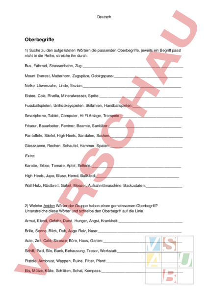 Deutsch Oberbegriffe 1) Suche zu den aufgelisteten Wörtern die passenden Oberbegriffe, jeweils ein Begriff passt nicht in die Reihe, streiche ihn durch: Bus, Fahrrad, Strassenbahn, Zug:_ Mount Everest, Matterhorn, Zugspitze, Gebirgspass: Nelke, Löwenzahn, Linde, Enzian: Eistee, Cola, Rivella, Mineralwasser, Sprite:_ Fussballspielen, Unihockeyspielen, Skifahren, Handballspielen:_ Smartphone, Tablet, Computer, HiFi Anlage, Trompete:_ Friseur, Bauarbeiter, Rentner, Beamte, Sanitäter: Pantoffeln, Stiefel, High Heels, Sandalen, Socken: Giesskanne, Rechen, Schaufel, Hammer, Spaten: Extra: Karotte, Erbse, Tomate, Apfel, Sellerie: High Heels, Jupe, Bluse, Hemd, Ballkleid:_ Wall Holz, Rüstbrett, Gabel, Messer, Aufschnittmaschine, Backzutaten:_ 2) Welche beiden Wörter der Gruppe haben einen gemeinsamen Oberbegriff? Unterstreiche diese Wörter und schreibe den Oberbegriff auf die Linie. Armut, Elend, Gefahr, Durst, Hunger, Angst, Krankheit: Brille, Sonne, Blick, Duft, Auge Reiz, Nase:_ Auto, Zelt, Café, Strasse, Büro, Haus, Garten:_ Schiff, Rad, Silo, Bank, Behausung, Tresor, Werkstatt: Pistole, Armbrust, Wappen, Ruine, Ritter, Pferd:_ Eis, Mütze, Kälte, Schlitten, Schal, Kompass: Deutsch Tiger, Löwe, Taube, Wurm, Hase, Kuh:_ Mütze, Sombrero, Abdeckung, Sonnenbrille, Sonne, Creme: Hai, Wal, Seelöwe, Eisbär, Katze, Tintenfisch, Hund: Extra: Welches Wort der Auswahl passt bei den Begriffspaaren? Schiff Leuchtturm Flughafen, Lotse, Kompass, Funkfeuer Flugzeug Lernen Wissen Haus, Spiel, Verdienst, Arbeit mauern Pullover Wärme Geld Sicherheit, Tresor, Kleidung, Schutz
