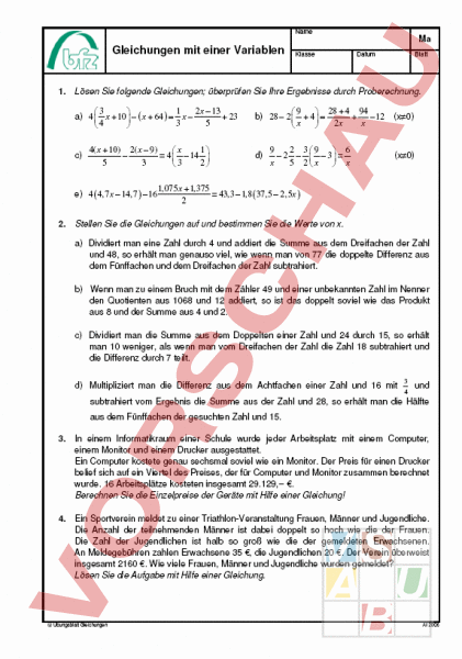 Name Gleichungen mit einer Variablen Klasse Ma Datum Blatt 1. Lösen Sie folgende Gleichungen; überprüfen Sie Ihre Ergebnisse durch Proberechnung. 1 2 13 3 a) 4 10 x 64 23 3 5 4 c) 4( 10) 2( 9) 1 x 4 14 5 3 2 3 e) 4 4,7 14,7 16 9 28 4 94 b) 28 2 4 12 2x x d) 9 2 3 9 6 2 3 5 2 x (x0) (x0) 1,075 1,375 43,3 1,8 37,5 2,5 ) 2 2. Stellen Sie die Gleichungen auf und bestimmen Sie die Werte von x. a) Dividiert man eine Zahl durch 4 und addiert die Summe aus dem Dreifachen der Zahl und 48, so erhält man genauso viel, wie wenn man von 77 die doppelte Differenz aus dem Fünffachen und dem Dreifachen der Zahl subtrahiert. b) Wenn man zu einem Bruch mit dem Zähler 49 und einer unbekannten Zahl im Nenner den Quotienten aus 1068 und 12 addiert, so ist das doppelt soviel wie das Produkt aus 8 und der Summe aus 4 und 2. c) Dividiert man die Summe aus dem Doppelten einer Zahl und 24 durch 15, so erhält man 10 weniger, als wenn man vom Dreifachen der Zahl die Zahl 18 subtrahiert und die Differenz durch 7 teilt. d) Multipliziert man die Differenz aus dem Achtfachen einer Zahl und 16 mit 3 4 und subtrahiert vom Ergebnis die Summe aus der Zahl und 28, so erhält man die Hälfte aus dem Fünffachen der gesuchten Zahl und 15. 3. In einem Informatikraum einer Schule wurde jeder Arbeitsplatz mit einem Computer, einem Monitor und einem Drucker ausgestattet. Ein Computer kostete genau sechsmal soviel wie ein Monitor. Der Preis für einen Drucker belief sich auf ein Viertel des Preises, der für Computer und Monitor zusammen berechnet wurde. 16 Arbeitsplätze kosteten insgesamt 29.129,-- €. Berechnen Sie die Einzelpreise der Geräte mit Hilfe einer Gleichung! 4. Ein Sportverein meldet zu einer Triathlon-Veranstaltung Frauen, Männer und Jugendliche. Die Anzahl der teilnehmenden Männer ist dabei doppelt so hoch wie die der Frauen. Die Zahl der Jugendlichen ist halb so groß wie die der gemeldeten Erwachsenen. An Meldegebühren zahlen Erwachsene 35 €, die Jugendlichen 20 €. Der Verein überweist insgesamt 2160 €. Wie viele Frauen, Männer und Jugendliche wurden gemeldet? Lösen Sie die Aufgabe mit Hilfe einer Gleichung. Übungsblatt Gleichungen Al/2006