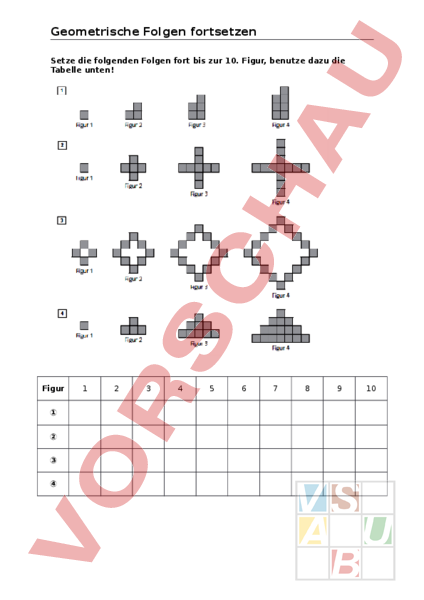 Geometrische Folgen fortsetzen Setze die folgenden Folgen fort bis zur 10. Figur, benutze dazu die Tabelle unten! Figur 1 2 3 4 5 6 7 8 9 10