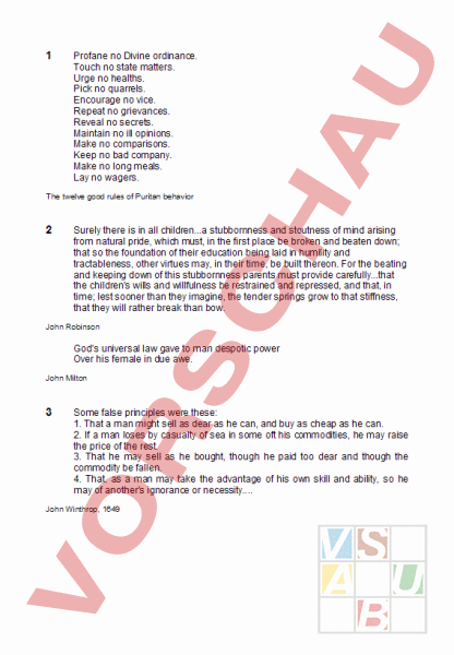 1 Profane no Divine ordinance. Touch no state matters. Urge no healths. Pick no quarrels. Encourage no vice. Repeat no grievances. Reveal no secrets. Maintain no ill opinions. Make no comparisons. Keep no bad company. Make no long meals. Lay no wagers. The twelve good rules of Puritan behavior 2 Surely there is in all children.a stubbornness and stoutness of mind arising from natural pride, which must, in the first place be broken and beaten down; that so the foundation of their education being laid in humility and tractableness, other virtues may, in their time, be built thereon. For the beating and keeping down of this stubbornness parents must provide carefully.that the children wills and willfulness be restrained and repressed, and that, in time; lest sooner than they imagine, the tender springs grow to that stiffness, that they will rather break than bow. John Robinson God universal law gave to man despotic power Over his female in due awe. John Milton 3 Some false principles were these: 1. That man might sell as dear as he can, and buy as cheap as he can. 2. If man loses by casualty of sea in some oft his commodities, he may raise the price of the rest. 3. That he may sell as he bought, though he paid too dear and though the commodity be fallen. 4. That, as man may take the advantage of his own skill and ability, so he may of another ignorance or necessity John Winthrop, 1649 Questions Source 1: Identify the basic Puritan beliefs Do you consider Puritanism repressive and intolerant moral and religious code or as realistic attempt to face up to the harsh realities of life? Source 2: What do these quotations suggest about Puritan attitudes toward women and children? Do you consider Puritanism repressive and intolerant moral and religious code or as realistic attempt to face up to the harsh realities of life? Source 3: In what ways did the Puritans attempt to make religion controlling force in everyday life? Do you consider Puritanism repressive and intolerant moral and religious code or as realistic attempt to face up to the harsh realities of life?