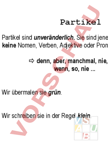 Partikel Partikel sind unveränderlich. Sie sind jene Wörter, die keine Nomen, Verben, Adjektive oder Pronomen sind. denn, aber, manchmal, nie, weil, aber, dass, wenn, so, nie . Wir übermalen sie grün. Wir schreiben sie in der Regel klein.