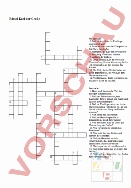 Rätsel Karl der Große 1 2 3 4 5 6 7 Waagerecht: 3. Welche Amt übten die Karolinger ursprünglich aus? 4. So bezeichnete man den Königshof zur Zeit Karls des Großen 7. Germanen, die Karl dem Großen über 30 Jahre lang Widerstand leisteten 9. Anführer der Sachsen 11. Ihnen übertrug Karl der Große die Verantwortung für eine Verwaltungsbezirk. 12. Grafschaften an den Grenzen des Reiches. 15. Ein Volk, das im Norden Italien ein Reich gegründet hat, das von Karl dem Großen erobert wird. 18. Westgermanen, denen es gelungen ist, ein großes Reich zu schaffen. 8 9 10 11 12 13 14 15 16 17 18 Senkrecht: 1. Heute noch bestehender Teil des einstigen Kirchenstaates. 2. Welchen Beiname erhielt jener Karolinger, dem es gelang, die Araber nach Spanien zurückzudrängen? 4. Welcher Karolinger setzte den letzten Merowingerkönig (Childerich III.) ab und ließ sich selbst zum König der Franken ernennen? 5. Wer leitete den Stallbereich? 6. Welches Herrschergeschlecht begründete das Reich der Franken? 8. Wen entsendete Karl der Große zur Überwachung der Grafen? 10. Wer verwaltete die königlichen Einnahmen? 13. Wer berät Karl den Großen und schreibt die Urkunden? 14. Welcher Herrscher ist dafür verantwortlich, dass die Franken zum katholischen Glauben übertraten? 16. Heute sprechen wir von Österreich wie hieß dieses Gebiet zur Zeit Karls des Großen? 17. Welcher Papst krönte Karl den Großen zum römischen Kaiser?