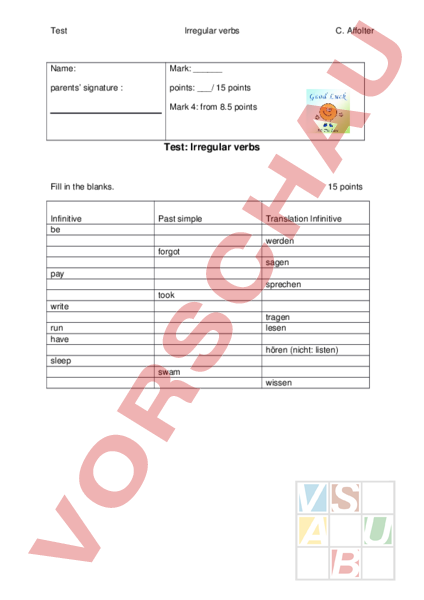 Test Irregular verbs Name: Mark: parents signature points:/ 15 points C. Affolter Mark 4: from 8.5 points Test: Irregular verbs Fill in the blanks. Infinitive be 15 points Past simple Translation Infinitive werden forgot sagen pay sprechen took write tragen lesen run have hören (nicht: listen) sleep swam wissen