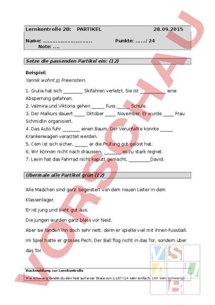Lernkontrolle 2B: PARTIKEL Name: Note: 28.09.2015 Punkte: / 24 Setze die passenden Partikel ein: (12) Beispiel: Yannik wohnt in Freienstein. 1. Giulia hat sich Skifahren verletzt. Sie ist eine Absperrung gefahren. 2. Valmira und Viktoria gehen Fuss Schule. 3. Der Malkurs dauert Oktober November. Er wurde Frau Schmidlin organisiert. 4. Das Auto fuhr einen Baum. Der Verunfallte konnte Krankenwagen verarztet werden. 5. Cem ist sich sicher, er die Prüfung gut gelöst hat. 6. Wir können nicht nach draussen, es zu stark regnet. 7. Levin hat das Fahrrad nicht kaputt gemacht, David. Übermale alle Partikel grün (12) Alle Mädchen sind ganz begeistert von dem neuen Leiter in dem Klassenlager. Er ist jung und sieht gut aus. Die Jungen wurden ganz blass vor Neid. Aber sie fanden ihn doch sehr nett, denn er spielte viel mit ihnen Fussball. Im Spiel hatte er grosses Pech. Der Ball flog nicht in das Tor, sondern über das Tor. Rückmeldung zur Lernkontrolle Wie schwierig fandst du den Test auf einer Skala von 1-10? (1 sehr einfach, 10 sehr schwierig). 1 2 3 4 5 6 7 8 9 10 Wie lange hast du dich zu Hause auf den Test vorbereitet? Minuten Was ich sonst noch sagen wollte: BEISPIEL: Ich löse noch die Zusatzaufgaben, da ich gut geübt habe. Die Familie fährt nach Italien ans Meer. Bei diesem schlechten Wetter verlasse ich das Haus nicht. Ich gehe schlafen, weil ich müde bin. Luca spielt auf dem Spielfeld nicht mit, denn er ist der Schiedsrichter. Ihr fahrt nicht mit dem Auto, sondern nehmt den Bus. Sobald ich in den Ferien bin, kann ich relaxen! Seit August haben wir wieder Schule, denn die Ferien sind vorbei. Während wir uns unterhielten, arbeiteten andere noch an der Prüfung. Präposition Konjunktion ZUSATZAUFGABE: Bestimme die unterstrichenen Partikel. (8)