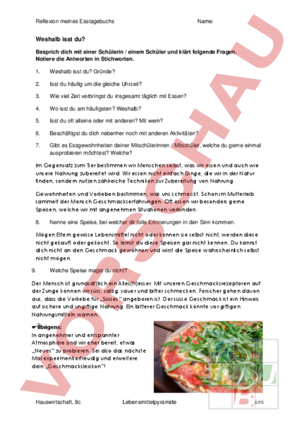 Reflexion meines Esstagebuchs Name: Weshalb isst du? Besprich dich mit einer Schülerin einem Schüler und klärt folgende Fragen. Notiere die Antworten in Stichworten. 1. Weshalb isst du? Gründe? 2. Isst du häufig um die gleiche Uhrzeit? 3. Wie viel Zeit verbringst du insgesamt täglich mit Essen? 4. Wo isst du am häufigsten? Weshalb? 5. Isst du oft alleine oder mit anderen? Mit wem? 6. Beschäftigst du dich nebenher noch mit anderen Aktivitäten? 7. Gibt es Essgewohnheiten deiner Mitschülerinnen Mitschüler, welche du gerne einmal ausprobieren möchtest? Welche? Im Gegensatz zum Tier bestimmen wir Menschen selbst, was wir essen und auch wie unsere Nahrung zubereitet wird. Wir essen nicht einfach Dinge, die wir in der Natur finden, sondern nutzen zahlreiche Techniken zur Zubereitung von Nahrung. Gewohnheiten und Vorlieben bestimmen, was uns schmeckt. Schon im Mutterleib sammelt der Mensch Geschmackserfahrungen. Oft essen wir besonders gerne Speisen, welche wir mit angenehmen Situationen verbinden. 8. Nenne eine Speise, bei welcher dir tolle Erinnerungen in den Sinn kommen. Mögen Eltern gewisse Lebensmittel nicht oder kennen sie selbst nicht, werden diese nicht gekauft oder gekocht. So lernst du diese Speisen gar nicht kennen. Du kannst dich nicht an den Geschmack gewöhnen und wirst die Speise wahrscheinlich selbst nicht mögen. 9. Welche Speise magst du nicht? Der Mensch ist grundsätzlich ein Alles(fr)esser. Mit unseren Geschmacksrezeptoren auf der Zunge können wir süss, salzig, sauer und bitter schmecken. Forscher gehen davon aus, dass die Vorliebe für „Süsses angeboren ist. Der süsse Geschmack ist ein Hinweis auf sichere und ungiftige Nahrung. Ein bitterer Geschmack könnte vor giftigen Nahrungsmitteln warnen. Übrigens: In angenehmer und entspannter Atmosphäre sind wir eher bereit, etwas „Neues zu probieren. Sei also das nächste Mal experimentierfreudig und erweitere dein „Geschmackslexikon! Hauswirtschaft, 8c Lebensmittelpyramide smi