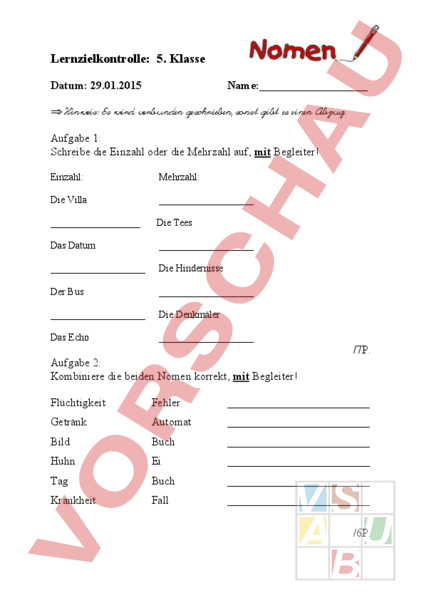 Lernzielkontrolle: 5. Klasse Datum: 29.01.2015 Name:_ Hinweis: Es wird verbunden geschrieben, sonst gibt es einen Abzug. Aufgabe 1: Schreibe die Einzahl oder die Mehrzahl auf, mit Begleiter! Einzahl: Mehrzahl: Die Villa Die Tees Das Datum Die Hindernisse Der Bus Die Denkmäler Das Echo /7P. Aufgabe 2: Kombiniere die beiden Nomen korrekt, mit Begleiter! Flüchtigkeit Fehler Getränk Automat Bild Buch Huhn Ei Tag Buch Krankheit Fall /6P. Aufgabe 3: Bilde mit der Endung –heit 3 Nomen: Bsp. Die Wahrheit 1. 2. 3. /3P. Aufgabe 4: Bilde mit der Endung –keit 3 Nomen: Bsp. Die Höflichkeit 1. 2. 3. /3P. Aufgabe 5: Suche im folgenden Text alle Nomen, übermale sie braun und korrigiere die Wörter, welche grossgeschrieben werden müssen. die reichen haben viel geld, aber auch viele probleme. mein freund fritz z.B. hat eine menge geld, aber er ist ein verschwender: er kauft sich täglich neue sachen. beim einkaufen schaut er nie auf den preis. gefällt ihm etwas billiges, dann kauft er es ohne zögern. denn er liebt das schöne an den gegenständen – qualität ist ihm gleichgültig. viele menschen sehen das anders, vor allem die reichen. sie kaufen nur dann etwas neues, wenn es teuer aussieht. das kann teuer werden. Du hast von 25 Punkten erreicht. Note: Unterschrift der Eltern: /6P.