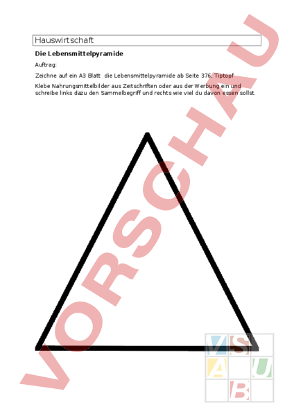 Hauswirtschaft Die Lebensmittelpyramide Auftrag: Zeichne auf ein A3 Blatt die Lebensmittelpyramide ab Seite 376, Tiptopf Klebe Nahrungsmittelbilder aus Zeitschriften oder aus der Werbung ein und schreibe links dazu den Sammelbegriff und rechts wie viel du davon essen sollst.