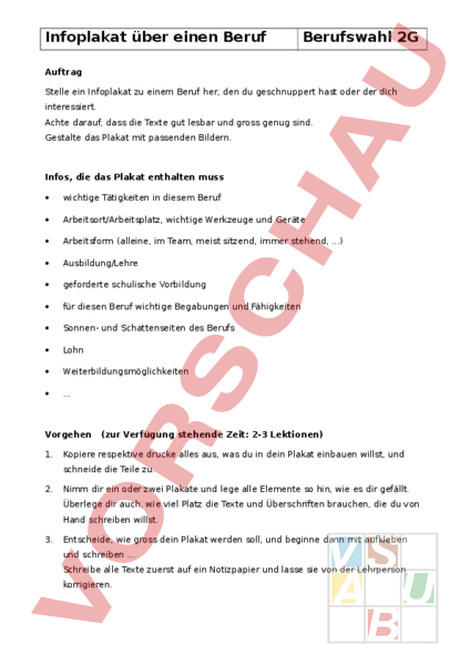 Infoplakat über einen Beruf Berufswahl 2G Auftrag Stelle ein Infoplakat zu einem Beruf her, den du geschnuppert hast oder der dich interessiert. Achte darauf, dass die Texte gut lesbar und gross genug sind. Gestalte das Plakat mit passenden Bildern. Infos, die das Plakat enthalten muss wichtige Tätigkeiten in diesem Beruf Arbeitsort/Arbeitsplatz, wichtige Werkzeuge und Geräte Arbeitsform (alleine, im Team, meist sitzend, immer stehend, .) Ausbildung/Lehre geforderte schulische Vorbildung für diesen Beruf wichtige Begabungen und Fähigkeiten Sonnen- und Schattenseiten des Berufs Lohn Weiterbildungsmöglichkeiten . Vorgehen 1. (zur Verfügung stehende Zeit: 2-3 Lektionen) Kopiere respektive drucke alles aus, was du in dein Plakat einbauen willst, und schneide die Teile zu. 2. Nimm dir ein oder zwei Plakate und lege alle Elemente so hin, wie es dir gefällt. Überlege dir auch, wie viel Platz die Texte und Überschriften brauchen, die du von Hand schreiben willst. 3. Entscheide, wie gross dein Plakat werden soll, und beginne dann mit aufkleben und schreiben . Schreibe alle Texte zuerst auf ein Notizpapier und lasse sie von der Lehrperson korrigieren.