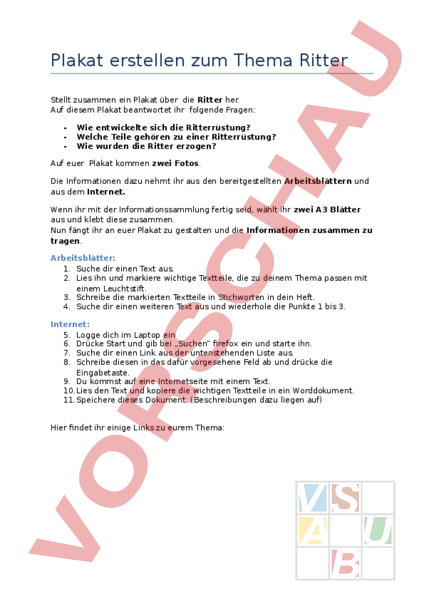 Plakat erstellen zum Thema Ritter Stellt zusammen ein Plakat über die Ritter her. Auf diesem Plakat beantwortet ihr folgende Fragen: Wie entwickelte sich die Ritterrüstung? Welche Teile gehören zu einer Ritterrüstung? Wie wurden die Ritter erzogen? Auf euer Plakat kommen zwei Fotos. Die Informationen dazu nehmt ihr aus den bereitgestellten Arbeitsblättern und aus dem Internet. Wenn ihr mit der Informationssammlung fertig seid, wählt ihr zwei A3 Blätter aus und klebt diese zusammen. Nun fängt ihr an euer Plakat zu gestalten und die Informationen zusammen zu tragen. Arbeitsblätter: 1. Suche dir einen Text aus. 2. Lies ihn und markiere wichtige Textteile, die zu deinem Thema passen mit einem Leuchtstift. 3. Schreibe die markierten Textteile in Stichworten in dein Heft. 4. Suche dir einen weiteren Text aus und wiederhole die Punkte 1 bis 3. Internet: 5. Logge dich im Laptop ein 6. Drücke Start und gib bei „Suchen firefox ein und starte ihn. 7. Suche dir einen Link aus der untenstehenden Liste aus. 8. Schreibe diesen in das dafür vorgesehene Feld ab und drücke die Eingabetaste. 9. Du kommst auf eine Internetseite mit einem Text. 10.Lies den Text und kopiere die wichtigen Textteile in ein Worddokument. 11.Speichere dieses Dokument. (Beschreibungen dazu liegen auf) Hier findet ihr einige Links zu eurem Thema:
