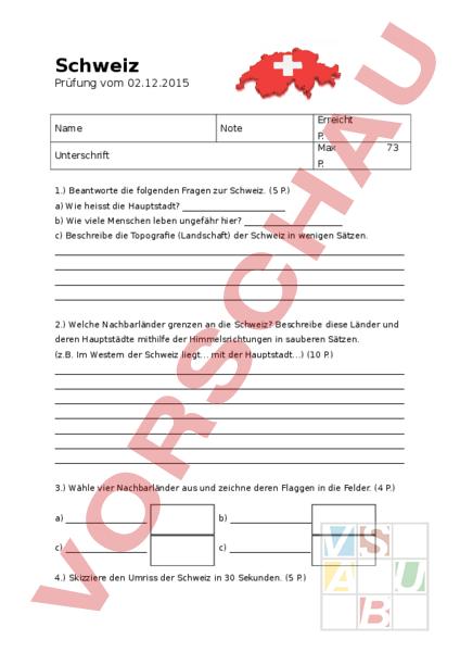 Schweiz Prüfung vom 02.12.2015 Name Note Unterschrift Erreicht P. Max 73 P. 1.) Beantworte die folgenden Fragen zur Schweiz. (5 P.) a) Wie heisst die Hauptstadt? b) Wie viele Menschen leben ungefähr hier? c) Beschreibe die Topografie (Landschaft) der Schweiz in wenigen Sätzen. 2.) Welche Nachbarländer grenzen an die Schweiz? Beschreibe diese Länder und deren Hauptstädte mithilfe der Himmelsrichtungen in sauberen Sätzen. (z.B. Im Western der Schweiz liegt mit der Hauptstadt) (10 P.) 3.) Wähle vier Nachbarländer aus und zeichne deren Flaggen in die Felder. (4 P.) a) b) c) c) 4.) Skizziere den Umriss der Schweiz in 30 Sekunden. (5 P.) 5.) Markiere auf dem Umriss die zehn grössten Städte der Schweiz und zusätzlich noch Arbon mit Zahlen und notiere sie auf den Linien. (11 P.) 6.) Notiere die gesuchten Gewässer. (10 P.) 4. 6. 8. 23. 18. 20. 14. 17. 19. 11. 7.) Fragen zu den Bergen in der Schweiz. (8 P.) a) Welches ist der höchste Berg der Schweiz? b) Nenne mir zwei bekannte Berge, welche beim Vierwaldstättersee liegen. c) Wie heisst unser Hausberg (Kt. SG)? d) Welcher Berg ist abgebildet? Beschreibe auch, wo der Berg liegt. e) Im Gotthardmassiv gibt es einen Wanderweg (85 km), der zu vier Quellen von bekannten Flüssen führt. Welche Flüsse könnten dort entspringen? 8.) Zeichne auf der Karte die folgenden Pässe ein und beschrifte sie mit den entsprechenden Buchstaben. (8 P.) a) San Bernadino d) Ofen b) Simplon e) Lukmanier c) Brünig f) Nufenen g) Maloja h) Flüela 9.) Ergänze die Tabelle. (8 P.) 7 5 3 8 2 6 Nr 1 Kanton 1 4 Abkürzu ng Hauptort 2 3 4 5 6 7 8 10.) Welche Kantone sind gesucht? (4 P.) Die Prüfung fand ich: einfach mittel Ich denke, ich werde etwa die folgende Note erreichen: schwer