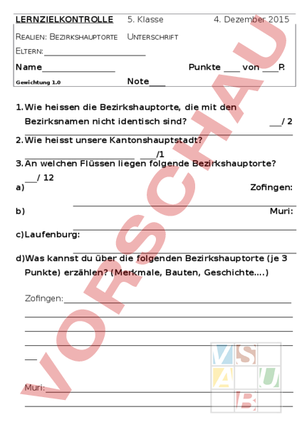 LERNZIELKONTROLLE 5. Klasse REALIEN: BEZIRKSHAUPTORTE UNTERSCHRIFT 4. Dezember 2015 ELTERN:_ Name Gewichtung 1.0 Punkte von P. Note 1.Wie heissen die Bezirkshauptorte, die mit den Bezirksnamen nicht identisch sind?/ 2 2.Wie heisst unsere Kantonshauptstadt? /1 3.An welchen Flüssen liegen folgende Bezirkshauptorte?/ 12 a) b) Zofingen: Muri: c)Laufenburg: d)Was kannst du über die folgenden Bezirkshauptorte (je 3 Punkte) erzählen? (Merkmale, Bauten, Geschichte.) Zofingen: Muri:_ Laufenburg: 4.Setze die passenden Wörter ein!/11 Brugg liegt an der . In der Nähe der Stadt treffen sich mitten in einer wunderbaren Auenlandschaft, und im Wasserschloss der Schweiz. Der Ortsname ist das schweizerdeutsche Wort für . Brugg war schon zur Zeit der sehr wichtig. Bei Brugg gab es früher eine römische Soldatenstadt (mit dem ersten Spital):. Heute heisst der Ort . Der gilt als Wahrzeichen von Brugg. 5.Wie heissen die Jugendfeste in Aarau und Brugg?/2 6.Verbinde die Bezirkshauptorte mit den Merkmalen!_/ 11 Ringier Brugg Erstes Kloster im Aargau Aarau Fohlenweide Baden Freiämter Mosterei Lenzburg Strafanstalt Bremgarten Beliebter Badeort Muri Regierungs – und Grossratsgebäude Rheinfelden Bierbrauerei Laufenburg Schalt- und Verteilanlage Zofingen Wynental Bad Zurzach Schwarzer Turm Unterkulm 7. Kreuze die richtigen Antworten an! Baden Limmat Tagsatzungssaal dreieckige Stadtanlage Grenzstädtchen ehemalige Kantonshauptstadt schwarzer Turm ABB Aarau Stadt der schönen Giebel Fohlenweide Glockengiesserei Maienzug Stausee grösste Druckerei der Schweiz Telli Regierungs- und Grossratsgebäude Bremgarten Stadt der schönen Giebel heilige Verena liegt an der Reuss Fohlenweide Mutschellenpass Flachsee Bad Zurzach/_ o o erstes Kloster im Aargau Wallfahrtsort Mineralwasser Strohmuseum Thermalquelle Rheinfelden Mittelpunkt im Freiamt älteste Stadt im Kanton Aargau Salzlager Strohmuseum Bölerpass 8.Benennt die Bezirke in der Zeichnung, ebenso die Nachbarkantone und das Nachbarland!/_