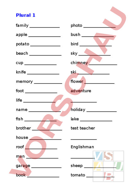 Plural 1 family photo apple bush potato bird beach sky cup chimney knife ski memory flower foot adventure life name holiday fish lake brother test teacher house roof Englishman man garage sheep book tomato aunt idea mouse picture office