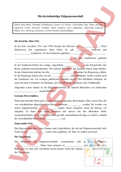 Die dreizehnörtige Eidgenossenschaft Zürich, Bern, Basel, Solothurn, Schaffhausen, Luzern, Uri, Schwyz, Unterwalden, Zug, Glarus, Freiburg, Appenzell, erobert, Dreizehn, verbündet, sieben, Familien, sechs, männlichen, Tagsatzung, Landvogt, Baden, zwei, schwierig, reformierte, schwach, Reichen, Entscheidungen Die dreizehn Alten Orte In der Zeit zwischen 1513 und 1798 bestand die Schweiz aus Orten (Kantonen), den sogenannten Alten Orten. Es gab Stadtorte und Länderorte. Zu den Stadtorten gehörten. Zu den Länderorten gehörten. In den Stadtorten hatten nur wenige, angesehene das Bürgerrecht (das Recht, politisch mitzubestimmen). Die meisten Bewohner der Stadtorte hatten keine Rechte. In den Länderorten durften fast alle Bewohner die Regierung wählen. In die Regierung kamen aber nur die und Gebildeten. Somit wurden auch die Länderorte nur von wenigen gehobenen Familien regiert. Den Reichtum erlangten sie meist mit dem Vermitteln von Söldnern, als Grundbesitzer, Kaufleute oder Viehhändler. Allgemein waren damals in der Eidgenossenschaft die meisten Menschen von politischen ausgeschlossen. Gemeine Herrschaften Nebst den dreizehn Orten gab es auch sogenannte gemeine Herrschaften. Dies waren Orte, die von verschiedenen eidgenössischen Orten gemeinsam wurden. Sie wurden von einem eidgenössischen regiert. Seine Aufgaben waren der Einzug von Abgaben. Er hatte aber keine Beamten und musste mit den Menschen direkt zusammenarbeiten. Diese waren aber nicht gewillt, unternehmerisch tätig zu werden, weshalb die wirtschaftliche Entwicklung war. Zugewandte Orte Die Zugewandten Orte waren Staaten und Landschaften, die mit der Eidgenossenschaft oder Teilen davon waren. Dazu gehörten z.B. Biel, St. Gallen und Genf. Die Tagsatzung Die Mitglieder der Eidgenossenschaft versammelten sich an der sogenannten . Diese fand meistens in statt, da es dort viele Bäder gab wo man sich verwöhnen lassen konnte. Jeder Ort schickte Abgesandte an die Tagsatzung. Die Verhandlungen waren aber oft , denn die Eidgenossenschaft war politisch gespalten, da sich katholische und Orte misstrauten. Ebenso hatten Länderorte und Stadtorte andere Interessen. Fragen zum Text: