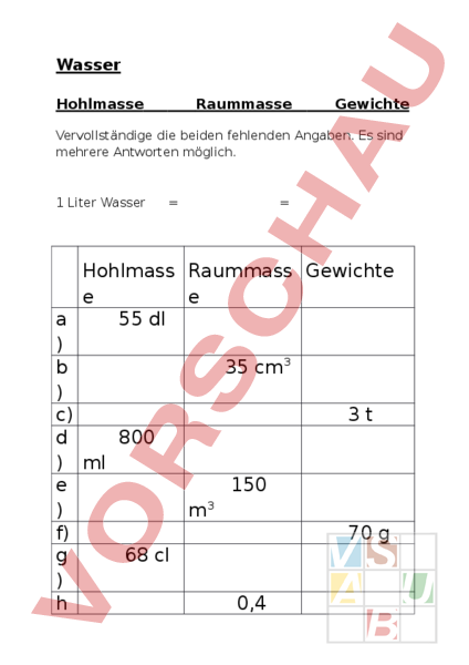 Arbeitsblatt: Wasserdichte: Hohlmasse=Raummasse=Gewichtmasse