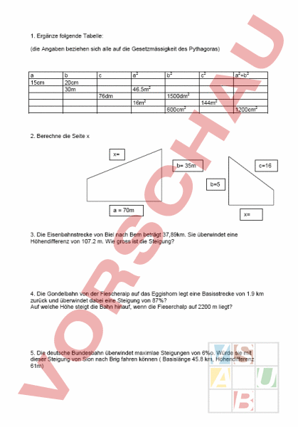 1. Ergänze folgende Tabelle: (die Angaben beziehen sich alle auf die Gesetzmässigkeit des Pythagoras) 15cm 20cm 30m a2 b2 c2 a2b2 46.5m2 1500dm2 76dm 16m2 144m2 2 1200cm2 600cm 2. Berechne die Seite x b 35m c16 b5 70m x 3. Die Eisenbahnstrecke von Biel nach Bern beträgt 37,89km. Sie überwindet eine Höhendifferenz von 107.2 m. Wie gross ist die Steigung? 4. Die Gondelbahn von der Fiescheralp auf das Eggishorn legt eine Basisstrecke von 1.9 km zurück und überwindet dabei eine Steigung von 87%? Auf welche Höhe steigt die Bahn hinauf, wenn die Fieserchalp auf 2200 liegt? 5. Die deutsche Bundesbahn überwindet maximlae Steigungen von 6%o. Würde sie mit dieser Steigung von Sion nach Brig fahren können Basislänge 45.8 km, Höhendifferenz 61m)
