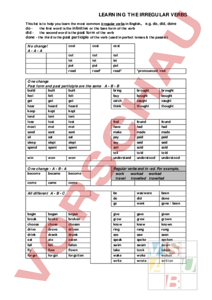 LEARNING THE IRREGULAR VERBS This list is to help you learn the most common irregular verbs in English., e.g. do, did, done do the first word is the infinitive or the bare form of the verb did the second word is the past form of the verb done the third is the past participle of the verb (used in perfect tenses the passive) No change! A-A-A cost cost cost cut let put read cut let put read* cut let put read* One change Past form and past participle are the same - - build built built bring feel felt felt buy get got got catch hear heard heard think keep kept kept lend lent lent lose lost lost find meet met met have send sent sent make sit sat sat pay sleep slept slept say spend spent spent sell tell win won won understand One change A B A become became become come came come All different - - began broke chose drove drank ate fell flew forgot begun broken chosen driven drunk eaten fallen flown forgotten brought bought caught thought brought bought caught thought found had made paid said sold told understood found had made paid said sold told understood Regular verbs end in -ed. For example, work worked worked travel travelled travelled be do go was/were did went been done gone been give grow know ring see speak swim take wake write gave grew knew rang saw spoke swam took woke wrote given grown known rung seen spoken swum taken woken written Churchill House School of English, Spencer Square, Ramsgate, CT11 9EQ, UK find more help for learners of English at begin break choose drive drink eat fall fly forget *pronounced /red/