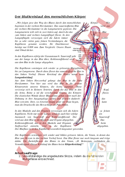 Der Blutkreislauf des menschlichen Körper „Wir folgen jetzt den Weg des Blutes durch den menschlichen beginnen in der rechten Herzkammer. Das sauerstoffarme Blut der rechten Herzkammer in die Lungenarterie gepresst. Die Lungenarterie teilt sich in zwei Adern auf, durch die das zum linken und rechten Lungenflügel fliesst. In den Lungenflügeln verzweigen sich die Adern immer bis zu sehr vielen ganz feinen Verästelungen, die Kapillaren genannt werden. Ihr Durchmesser beträgt nur 0.008 mm. Zum Vergleich: Unsere Haare sind 10mal dicker. Körper. Wir wird aus Blut weiter In den Kapillaren erfolgt der Gasaustausch: Sauerstoff geht aus der Lunge in das Blut über, Kohlenstoffdioxid wird aus dem Blut in die Lunge abgegeben. Die Kapillaren vereinigen sich wieder zu grösseren Blutgefässen, bis zur Lungenvene. Durch diese fliesst das sauerstoffreiche Blut in den linken Vorhof. Diesen Kreislauf des Blutes nennt man Lungenkreislauf. Aus dem linken Herzvorhof gelangt das Blut in die linke Herzkammer. Von hier aus wird das Blut in die grösste Körperarteie unseres Körpers, die Aorta gepumpt. Diese verzweigt sich in kleinere Arterien, durch die das Blut in den die Arme, Beine nd die verschiedene Organe des Körpers Die elastischen Wände dieser Blutgefässe gehen sofort nach der Dehnung in ihre Ausgangslage zurück und drücken dadurch Blut vorwärts. Dort, wo Arterien knapp unter der Haut liegen, man die Druckwelle des Herzschlags als Puls fühlen. In den Muskeln und den Organen verzweigen sich die Adern Kapillaren. Nicht nur in der Lunge, sondern auch hier erfolgt Austausch von Sauerstoff und Kohlenstoffdioxid: Der wird aus dem Blut in die Muskeln und Organe abgegeben. Kohlenstoffdioxid, das in den Muskeln und Organen Stoffwechsel entsteht, wird in die Kapillaren Der Blutfluss ist in den Kapillaren wesentlich langsamer geworden. Kopf, fliesst. das kann zu feinen ein Sauerstoff Das beim abgegeben. Die Kapillaren vereinigen sich wieder und bilden grössere Adern, die Venen, in denen das Blut zum Herzen in den rechten Vorhof liesst. Das Blut fliesst nur noch langsam und träge dahin. Ein Zurückfliessen des Blutes in den Venen, z.B. Beinvenen, verhindern die Venenklappen. Dieser Kreislauf des Blutes heisst Körperkreislauf. Arbeitsauftrage 1. Vervollständige die angedeutete Skizze, indem du die fehlenden Blutgefässe einzeichnest. 2. Gib mit Pfeilen die Fliessrichtung des Blutes in den verschiedenen Teilen des Blutkreislaufs an. 3. Beschrifte die Skizze mit folgenden Begriffen: Grosse Körperarterie (Aorta), Körpervene (Hohlvene), Lungenarterie, Lungenvene, Lungenkreislauf, Körperkreislauf 4. Bemale die Teile des Blutkreislaufs, die sauerstoffreiches Blut transportieren, rot; die Teile mit kohlenstoffdioxidreichem Blut blau. 5. Beantworte folgende Fragen: a) Was ist mit Gasaustausch gemeint? b) Wohin führen Arterien das Blut? c) Wohin führen Venene das Blut? d) Durch die grösseren Arterien fliesst das Blut mit einer Geschwindigkeit von 30 cm pro Sekunde. In den Venen legt es in der gleichen Zeit nicht einmal mehr 1 cm zurück. Erkläre diese Unterschied.