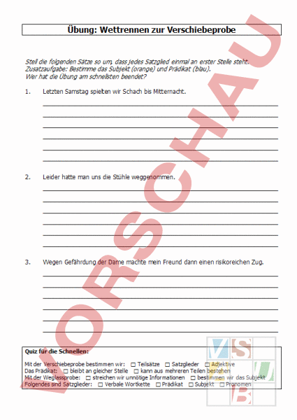 Übung: Wettrennen zur Verschiebeprobe Stell die folgenden Sätze so um, dass jedes Satzglied einmal an erster Stelle steht. Zusatzaufgabe: Bestimme das Subjekt (orange) und Prädikat (blau). Wer hat die Übung am schnellsten beendet? 1. Letzten Samstag spielten wir Schach bis Mitternacht. 2. Leider hatte man uns die Stühle weggenommen. 3. Wegen Gefährdung der Dame machte mein Freund dann einen risikoreichen Zug. Quiz für die Schnellen: Mit der Verschiebeprobe bestimmen wir: Teilsätze Satzglieder Adjektive Das Prädikat: bleibt an gleicher Stelle kann aus mehreren Teilen bestehen Mit der Weglassprobe: streichen wir unnötige Informationen bestimmen wir das Subjekt Folgendes sind Satzglieder: Verbale Wortkette Prädikat Subjekt Pronomen