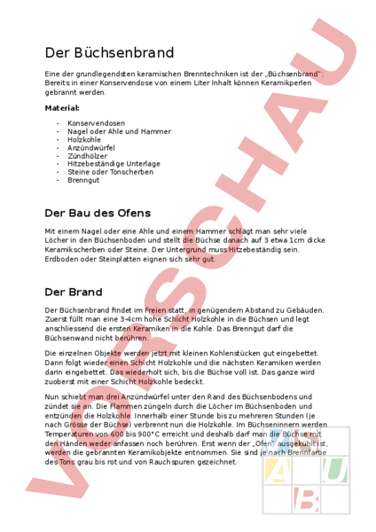 Der Büchsenbrand Eine der grundlegendsten keramischen Brenntechniken ist der „Büchsenbrand: Bereits in einer Konservendose von einem Liter Inhalt können Keramikperlen gebrannt werden. Material: Konservendosen Nagel oder Ahle und Hammer Holzkohle Anzündwürfel Zündhölzer Hitzebeständige Unterlage Steine oder Tonscherben Brenngut Der Bau des Ofens Mit einem Nagel oder eine Ahle und einem Hammer schlägt man sehr viele Löcher in den Büchsenboden und stellt die Büchse danach auf 3 etwa 1cm dicke Keramikscherben oder Steine. Der Untergrund muss Hitzebeständig sein. Erdboden oder Steinplatten eignen sich sehr gut. Der Brand Der Büchsenbrand findet im Freien statt, in genügendem Abstand zu Gebäuden. Zuerst füllt man eine 3-4cm hohe Schicht Holzkohle in die Büchsen und legt anschliessend die ersten Keramiken in die Kohle. Das Brenngut darf die Büchsenwand nicht berühren. Die einzelnen Objekte werden jetzt mit kleinen Kohlenstücken gut eingebettet. Dann folgt wieder einen Schicht Holzkohle und die nächsten Keramiken werden darin eingebettet. Das wiederholt sich, bis die Büchse voll ist. Das ganze wird zuoberst mit einer Schicht Holzkohle bedeckt. Nun schiebt man drei Anzündwürfel unter den Rand des Büchsenbodens und zündet sie an. Die Flammen züngeln durch die Löcher im Büchsenboden und entzünden die Holzkohle. Innerhalb einer Stunde bis zu mehreren Stunden (je nach Grösse der Büchse) verbrennt nun die Holzkohle. Im Büchseninnern werden Temperaturen von 600 bis 900C erreicht und deshalb darf man die Büchse mit den Händen weder anfassen noch berühren. Erst wenn der „Ofen ausgekühlt ist, werden die gebrannten Keramikobjekte entnommen. Sie sind je nach Brennfarbe des Tons grau bis rot und von Rauchspuren gezeichnet.