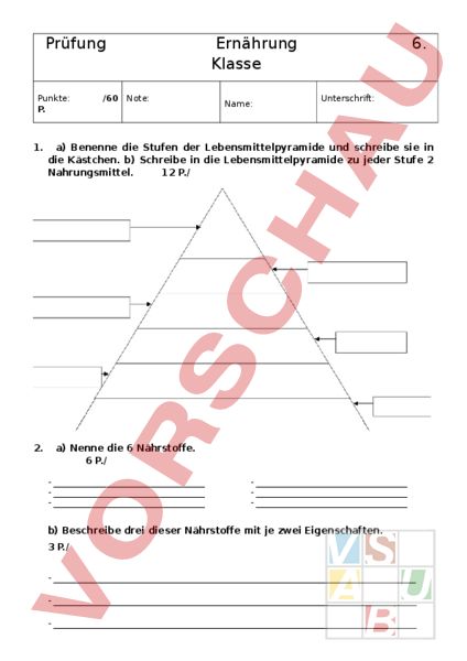Prüfung Punkte: P. 1. 2. /60 Note: Ernährung Klasse Name: 6. Unterschrift: a) Benenne die Stufen der Lebensmittelpyramide und schreibe sie in die Kästchen. b) Schreibe in die Lebensmittelpyramide zu jeder Stufe 2 Nahrungsmittel. 12 P./ a) Nenne die 6 Nährstoffe. 6 P./ b) Beschreibe drei dieser Nährstoffe mit je zwei Eigenschaften. 3 P./ 3. Teile die Lebensmittel der richtigen Art von Fett zu und verbinde sie damit. 6 P./ Sichtbare Fette Versteckte Fette Versteckte Fette in Genussmitteln 4. Die Vitamine haben viele wichtige Aufgaben in unserem Körper. Nenne vier davon. 4 P./ 5. Wofür braucht unser Körper Kohlenhydrate? Nenne zwei Gründe. 2 P./ 6. Nenne drei Zuckersorten und beschreibe sie kurz. 6 P./ 7. Was sind Folgen von ungesunder Ernährung? Nenne drei. 3 P./ 8. Nenne zwei Gründe, warum unser Körper immer genügend Flüssigkeit braucht. 2 P./ 9. Ordne die folgenden Getränke in die Tabelle ein. 6 P./ Natürlicher Orangensaft, Red Bull, Rivella, Früchtetee, Eistee, Mineralwasser mit Kohlensäure, Sprite, Milch, frischer Apfelsaft, Cola, Pfefferminztee, Fanta Gesunde Getränke Ungesunde Getränke 10. Die untenstehenden Organe sind an der Verdauung beteiligt. Beschreibe jeweils zwei wichtige Punkte ihrer Funktion. 6 P./ Magen: Dickdarm: Leber: 11. Beschreibe in deinen eigenen Worten was Magersucht ist und nenne zwei Folgen, die sie haben kann. 4 P./ Wie ist dir die Prüfung gelaufen? Male ein Smiley aus. Das war ja locker! Fast alles habe ich gewusst. Naja, ging so. Ich habe einiges nicht gewusst. Schlimmer als Zähne ziehen!