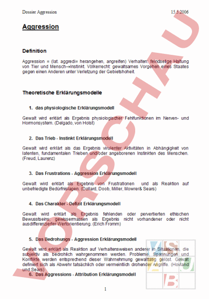 Dossier Aggression 15.5.2006 Aggression Definition Aggression (lat. aggredi herangehen, angreifen) Verhalten: feindselige Haltung von Tier und MenschInstinkt. Völkerrecht: gewaltsames Vorgehen eines Staates gegen einen Anderen unter Verletzung der Gebietshoheit. Theoretische Erklärungsmodelle 1. das physiologische Erklärungsmodell Gewalt wird erklärt als Ergebnis physiologischer Fehlfunktionen im Nerven- und Hormonsystem. (Delgado, von Holst) 2. Das Trieb Instinkt Erklärungsmodell Gewalt wird erklärt als das Ergebnis virulenter Aktivitäten in Abhängigkeit von latenten, fundamentalen Trieben und/oder angeborenen Instinkten des Menschen. (Freud, Laurenz) 3. Das Frustrations Aggression Erklärungsmodell Gewalt wird erklärt als Ergebnis von Frustrationen und als Reaktion auf unbefriedigte Bedürfnislagen. (Dollard, Doob, Miller, Mowrer& Sears) 4. Das Charakter Defizit Erklärungsmodell Gewalt wird erklärt als Ergebnis fehlenden oder pervertierten ethischen Bewusstseins; gewissermassen als Ergebnis nicht vorhandener oder nicht ausdifferenzierter Wertorientierung. (Erich Fromm) 5. Das Bedrohungs Aggression Erklärungsmodell Gewalt wird erklärt als Reaktion auf Verhaltensweisen anderer in Situationen, die subjektiv als bedrohlich wahrgenommen werden. Probleme, Spannungen und Konflikte werden entsprechend dieser Wahrnehmung gewalttätig gelöst. Gewalt definiert sich als Abwehr tatsächlich oder vermeintlich drohender Angriffe. (Hovland und Sears) 6. Das Aggressions Attribution Erklärungsmodell 1 Dossier Aggression 15.5.2006 Gewalt wird erklärt als das Zusammenwirken ganz bestimmter psychischer Prozesse und ganz bestimmter sozialer Situationen. Die psychischen Prozesse werden dabei durch feindselige Zuschreibungen bestimmt, d.h. dem Gegenüber werde von vornherein aggressive Absichten unterstellt und zugeschrieben; bei den sozialen Situationen sind besonders die spezifisch gewaltlösend, die sich durch Uneindeutigkeit auszeichnen. Das bedeutet etwa, dass Menschen, die als aggressiv gelten, in einem Zirkel von feindseligen Zuschreibungen (Attributionen), gewalttätigem Verhalten und sozialer Etikettierung verfangen sind, der besonders dann wirksam wird, wenn soziale Situationen ungeklärt und mehrdeutig sind. (Dodge) 7. Das Segregations Aggression Erklärungsmodell Gewalt wird erklärt als Ergebnis sozialer Ausgrenzung und damit verbundener reduzierter Kommunikation und sozialer Interaktion, wobei durch die Verständnisbarrieren ein eskalierender, sich selbst stabilisierender Kreislauf von Gewalt und Gegengewalt entsteht. (Newcomb und Sherif) 8. Soziale Desintegration als Erklärungsmodell Gewalt wird erklärt als das Zusammenwirken von Sozialisationsfaktoren, die allesamt eine soziale Entwurzelung und damit eine Orientierungslosigkeit für den einzelnen zur Folge haben. 9. Das Modell Lernen als Erklärungsansatz Gewalt wird erklärt als Ergebnis eines erlernten Verhaltensmodells, das sich entweder als erfolgreich bewährt hat oder zu dem (noch) keine als tragfähig sich erwiesene Alternative aufgebaut werden konnte. (Selg, Bandura) 10. Urteilskompetenz Defizit als Erklärungsmodell Gewalt – im Sinne von der hier zur Diskussion stehenden Alltagsgewalt von Kinder und Jugendlichen – wird erklärt als ein Verhalten, das stärker und spontane, emotionale und affektive Faktoren gesteuert wird als durch eine moral-kognitive Reflexion, die das eigene Handeln begründet und im Sinne einer entwickelten Urteilskompetenz an überindividuellen Werten und/oder Prinzipien sich orientiert. Ursachen von Aggression Nach Boppel lassen sich grundsätzlich zwei Ursachen aggressiven Verhaltens unterscheiden: 2 Dossier Aggression 15.5.2006 Die Selbsterhaltungsaggression betrifft angeborene Verhaltensweisen, wie sie sich durch Selektion und Mutation in der Evolution herausgebildet haben. Sie dienen der Selbst- und Revierverteidigung, der Fortpflanzung, der Nahrungsaufnahme, der LustFreude-Beschaffung, der Ermittlung der Rangposition und der eigenen Grenzen sowie dem Erreichen und Erhalten von Sicherheit, Selbstwertgefühl und des Selbststolzes. Diese Form der Aggression dient im evolutiven Prozess dazu, die Lebensrecourssen zu erhalten und zu erweitern. Die destruktive Aggression dagegen betrifft schädigendes Verhalten mit dem Zweck, durch Leidzufügung materiellen Gewinn, soziale Anerkennung und Macht, innere Befriedigung oder Stimulation zu erzielen. Dabei wird langfristig ein evolutiver Sinn nicht erkennbar, im Gegenteil: Erhaltenswerte und lebenswichtige Recourssen werden vernichtet, soziale Probleme werden nicht nur nicht gelöst, vielmehr werden Gewalt-Gegengewalt-Zirkelprozesse ausgelöst. Solchen destruktiven Prozessen stehen normalerweise Tötungshemmungen, Empathie, Moral und Gewissensbildung entgegen, die allerdings unter definierten Bedingungen ausser Kraft gesetzt werden können. Mögliche Ursachen von Aggressivität und Gewalt in der Schule Die Kinder und Jugendlichen ging es noch nie so gut wie Heute. Im sogenannten Westen sind sie in hohem Masse selbständig, geniessen eine freizügige Erziehung ohne autoritäre Allüren der Eltern und können sich in ihrer Lebensgestaltung nach eigenen Wünschen und Interessen entfalten. Gesundheitlich und finanziell stehen sie so gut da wie keine Generation vor ihnen. Jedoch stellt man sich bei weiterem überlegen immer mehr Fragezeichen. In den sozialen Bereichen fällt uns auf wie unsicher die Beziehungen und sozialen Kontakte von Kindern und Jugendlichen geworden sind. Sie können fast in gleichem Ausmass wie Erwachsene die Vorteile einer reichen Wohlfahrtsgesellschaft geniessen und damit verbunden tragen sie auch die psychosozialen Probleme der modernen Lebensweise. Sie leiden unter sozialen Unsicherheiten und psychischen Irritationen. Man geht davon aus, dass zirka 10% der Schulkinder unter psychischen Störungen in den Bereichen Leistung, Emotionen und Sozialkontakt leiden. Dazu gehören auch aggressive und gewalttätige Verhaltensweisen. Für 
