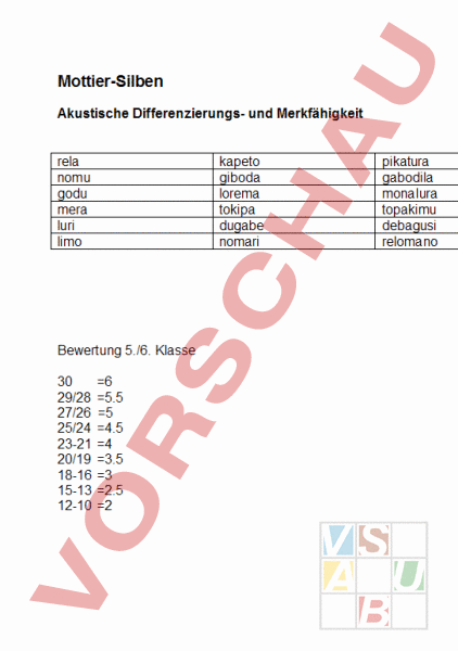 Mottier-Silben Akustische Differenzierungs- und Merkfähigkeit rela nomu godu mera luri limo kapeto giboda lorema tokipa dugabe nomari Bewertung 5./6. Klasse 30 29/28 27/26 25/24 23-21 20/19 18-16 15-13 12-10 6 5.5 5 4.5 4 3.5 3 2.5 2 pikatura gabodila monalura topakimu debagusi relomano katopinafe gebidafino ronamelita tapikusawe degobesaro muralenoka pekatorisema dagobilaseta leraminofeko kapotilafesa bigadonafera momalirakosa